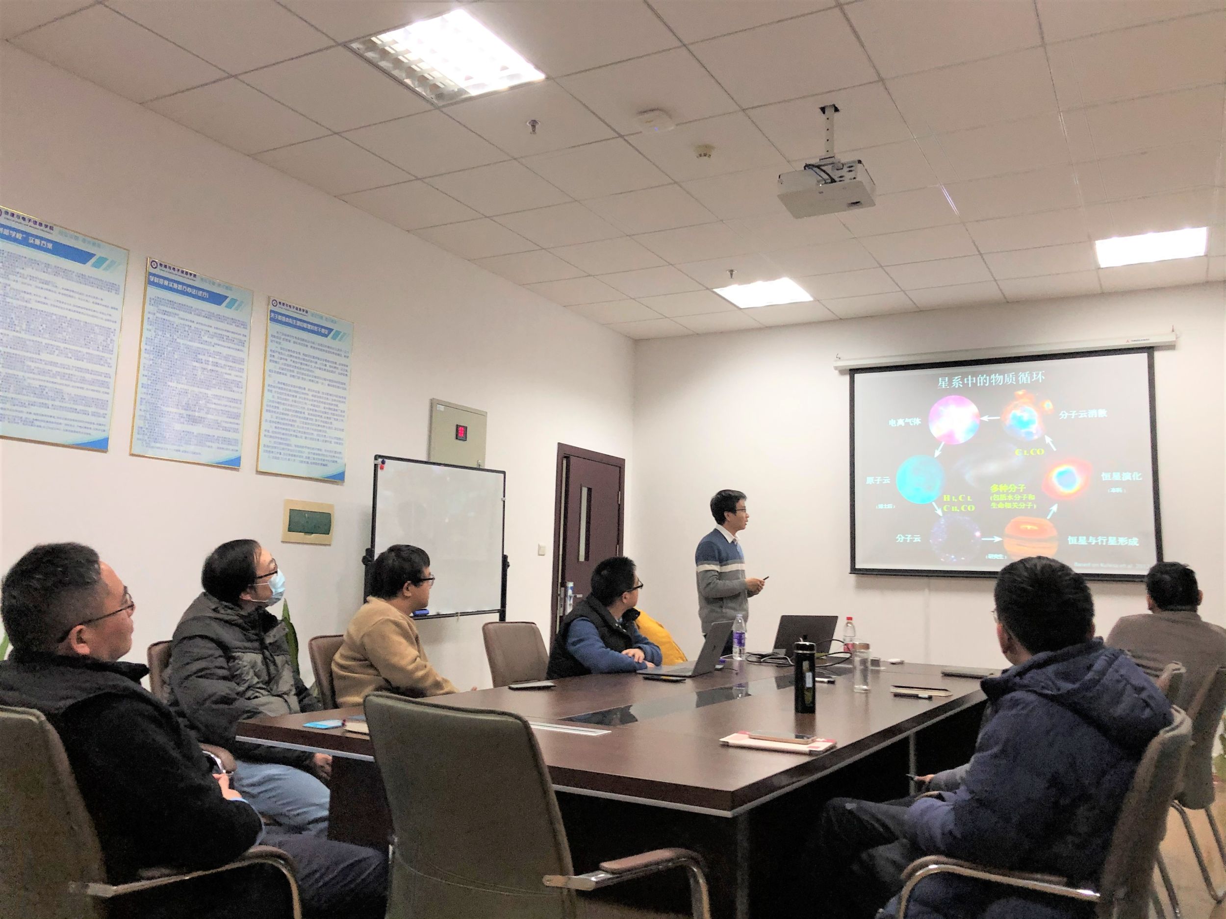 星际空间中的分子云是如何形成的,这一关键问题一直以来是天体物理中的前沿也是悬而未决的难题。报告会上,王晨博士重点介绍了目前国际上普遍接受的两种分子云形成的基本物理图像,以及近期利用银河画卷数据对分子云大样本研究所取得的一些系统性的成果,包括分子云中化学丰度的演化与周围环境的关系,不同同位素分子的观测流量比等等。此外,他详细阐述了目前正在开展的利用FAST CRAFTS巡天数据研究分子云形成的初步结果。报告会结束后,与会师生就相关问题同王晨博士展开了热烈讨论和交流。