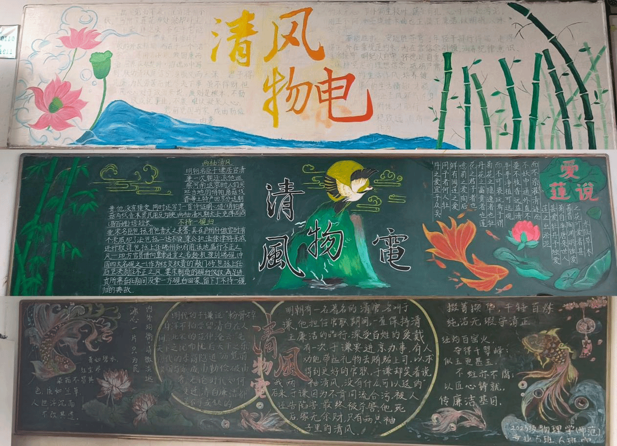 学院在毕业季立足新时代廉洁文化“一院一品”创建活动,线下2023级物理学(师范)专业各班级围绕“清风物电”的主题,对所属责任教室进行了精心布置和装饰,从墙面的设计到角落的布置,从板报的绘制到饰品的点缀,充分营造了清风正气满校园的良好育人环境;线上结合“物电学生核聚变”公众号等平台,发布《清风启程,行稳致远:致无翼鸟