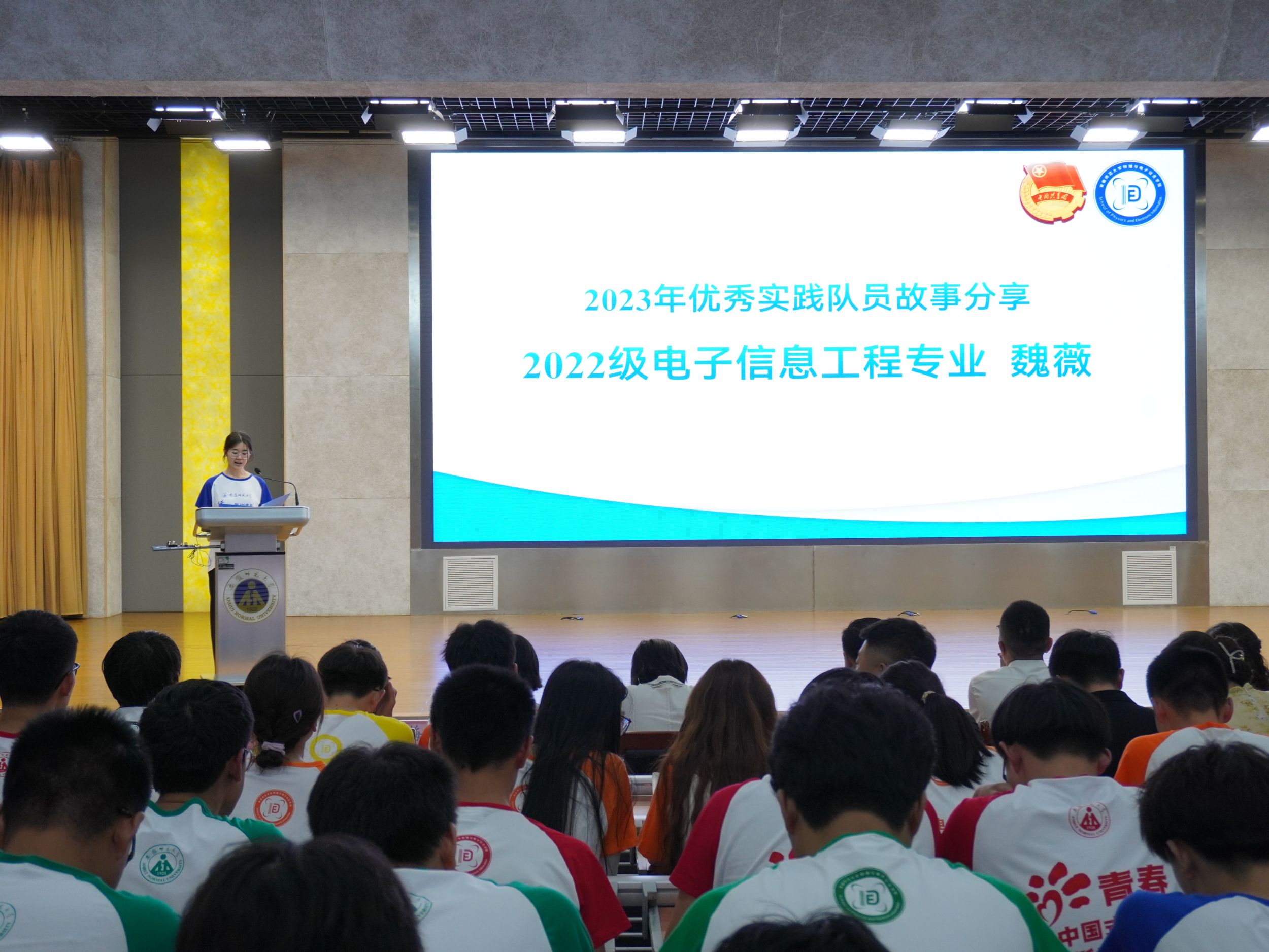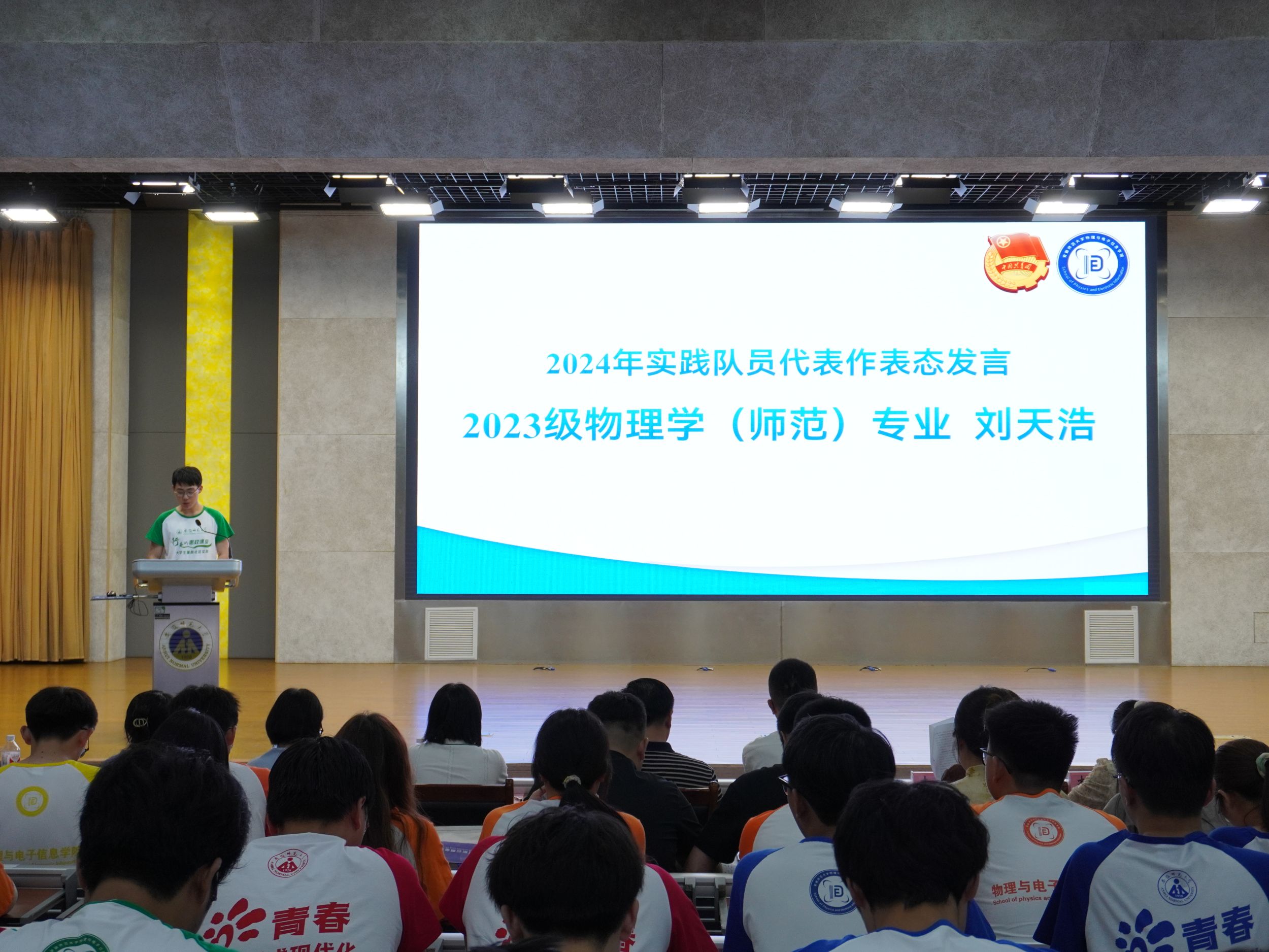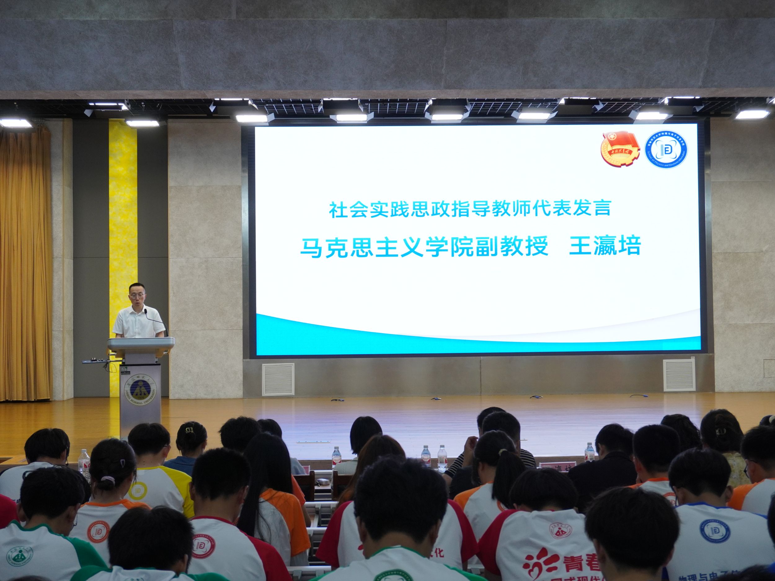 2023年暑期社会实践先进个人、2022级电子信息工程专业魏薇同学在仪式上分享了她的实践故事和心得感悟。2024年暑期社会实践队员代表、2023级物理学(师范)专业刘天浩同学作表态发言。王瀛培作指导讲话。他指出,“大思政课”建设的重要实践旨在引导广大学生在社会实践中感悟和把握马克思主义的真理力量,同学们应当在社会实践中从思想政治层面深刻感悟的中国化时代化的马克思主义真理。他反复提醒同学们要做好成果固化,把志愿服务成效、科研创新镌刻在祖国大地上。