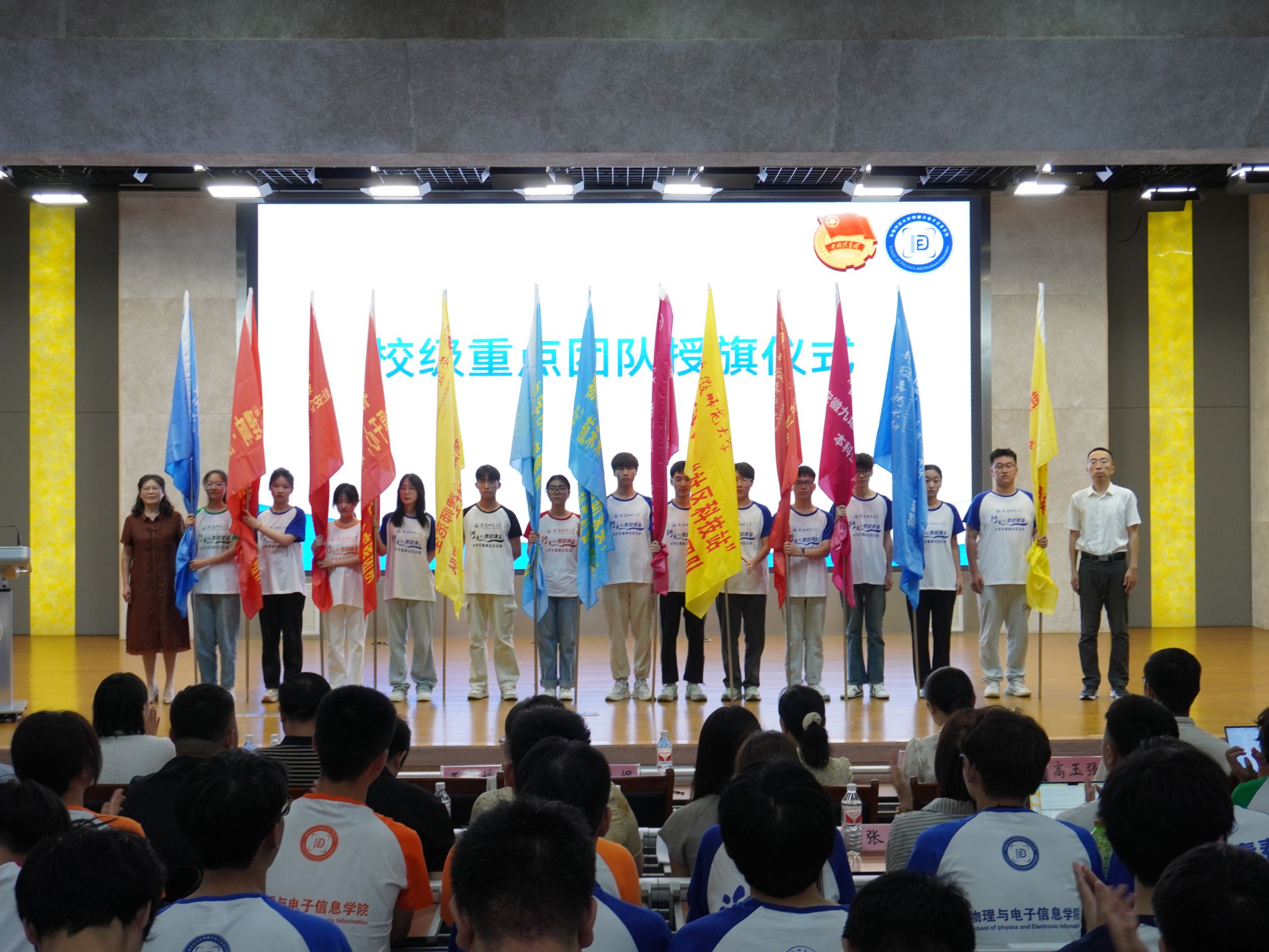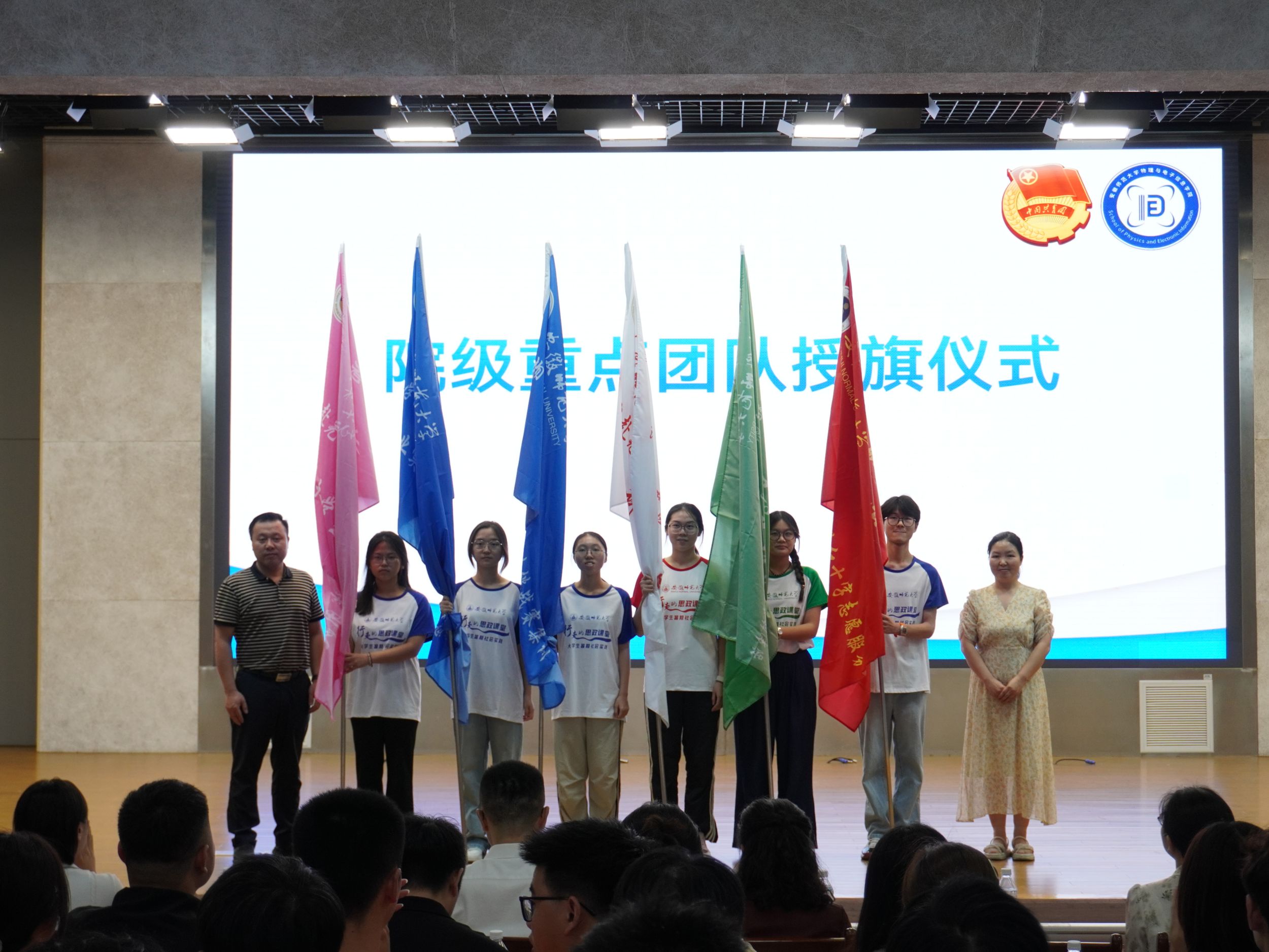 出征仪式在嘹亮的团歌中拉开帷幕。黄友生从整体规划、活动内容、分层实践、考核要求四个方面介绍了学院2023年暑期社会实践方案和考核要求。他指出,实践团队须精心组织、务求实效、固化材料、加强宣传,带队教师须全程指导、确保安全。张爱清宣读2024年暑期社会实践活动校级、院级重点团队名单。李娟、王瀛培为13支校级团队授旗,黄友生、李靖为6支院级团队授旗。
