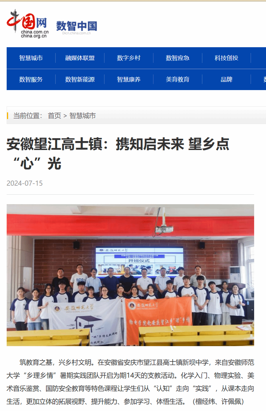 筑教育之基,兴乡村文明。在安徽省安庆市望江县高士镇新坝中学,来自安徽师范大学“乡理乡情”暑期实践团队开启为期14天的支教活动。化学入门、物理实验、美术音乐鉴赏、国防安全教育等特色课程让学生们从“认知”走向“实践”,从课本走向生活,更加立体的拓展视野、提升能力、参加学习、体悟生活。(檀经纬、许佩佩)