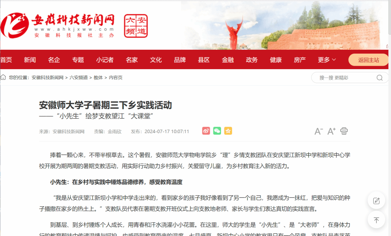 当“小先生”走进基层乡村的“大课堂”,既是教学者,也是学习者。接下来,团队将继续在安庆望江新坝镇开展乡“理”乡情支教志愿服务活动,将个人所学运用于实际教学,在实践中受教育、爱教育、懂教育,以乡村教育振兴为引擎,为新农村建设注入发展动力。(周经晶 檀经纬 王雨婷 万辰睿 潘析文)