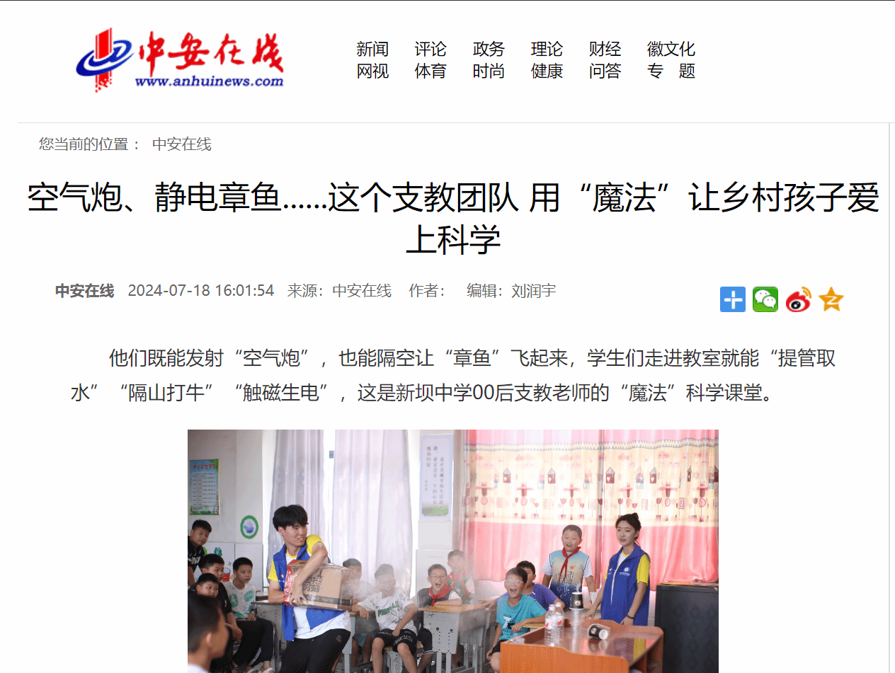 乡“理”乡情支教团队的24名大学生在安庆望江新坝中学和新坝中心学校开启了为期两周的支教之旅。在众多课程中最受学生们喜爱的便是被称为“魔法课”的“金苹果科普”系列科学实验课程,实验中涉及“压力”“摩擦力”“楞次定律”等多个物理知识,团队成员表示:“我们希望通过暑期支教,让乡村的留守儿童也能和城里的孩子一样,拓宽视野,能懂得科学、会用科学、从小爱上科学”。