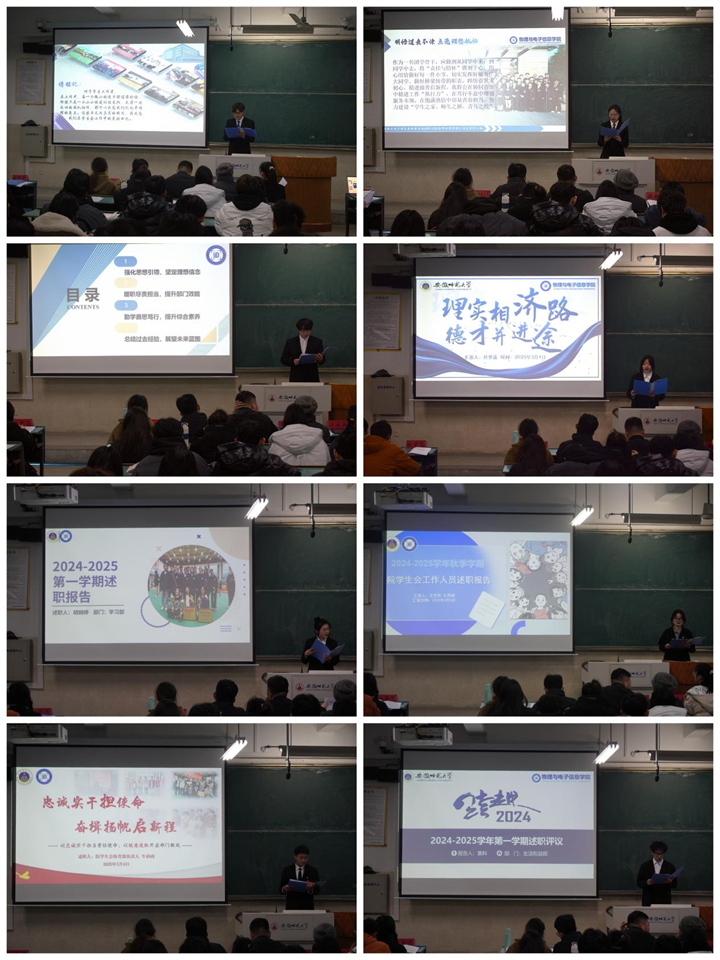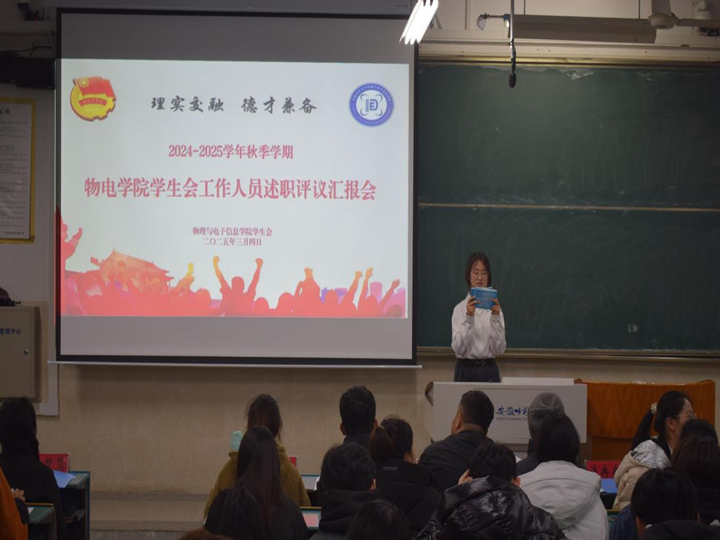 学生会2024-2025学年秋季学期工作人员述职评议汇报会在行知楼1号楼407教室顺利召开。院团委书记布赫、院学生会指导老师邹孝龙、院团委学生副书记蒋承瑞、校学生会代表曹睿出席汇报会,出席本次会议的还有学院学生会主席团成员、各部门负责人、院学生会全体工作人员、各班班长以及学生代表。会议由院学生会工作人员翟思雨主持。
