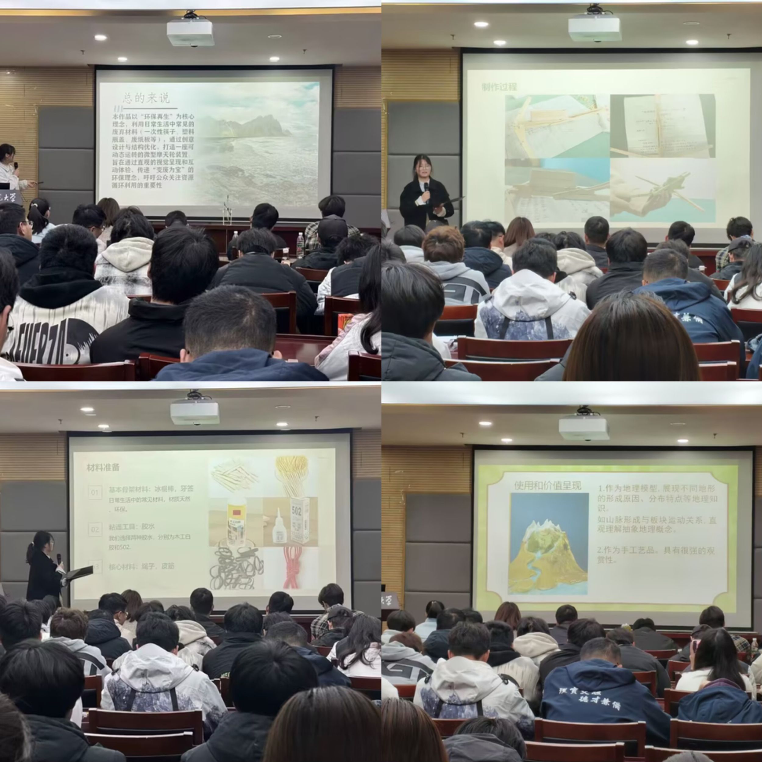 汇报中,赵昕源组用塑料瓶裁剪、高温弯曲定型、热熔固定、从而呈现出莲花的造型;肖宏亮组的花灯由三角板、草稿纸、小灯、胶水、麻绳组成,寄托了童年的怀念;吕静怡组以“环保再生”为核心理念,利用日常生活中常见的废弃材料一次性筷子、塑料瓶盖、废纸板等,通过创意设计与结构优化,打造一座可动态运转的微型摩天轮装置;安虹畅组利用从废弃的玩具车上拆下的电路板、小马达、废弃的木板,加上从电动自拍杆上拆下来的电池盒制作了自制遥控小车。