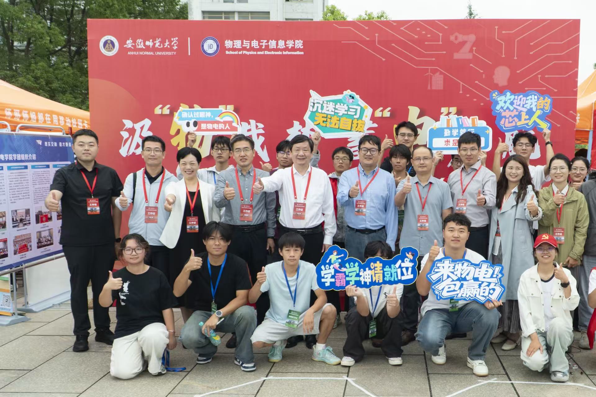 报到现场,学院设置“迎新生”学术科技作品展,集中呈现物电学子的创新成果。从仿人机器人、智能汽车、5G远程驾驶车、四旋翼无人机,到物理师范生自制的法拉第磁生电实验装置、受迫振动与共振演示仪等教具,门类丰富、创意十足。学生志愿者现场进行操作演示和专业讲解,帮助新生直观感受学科魅力,增强专业认同。现场还通过学院学团组织介绍、育人品牌项目展示、2025届考研光荣榜、学科竞赛光荣榜等宣传展板,进一步强化学风建设和专业思想教育。
