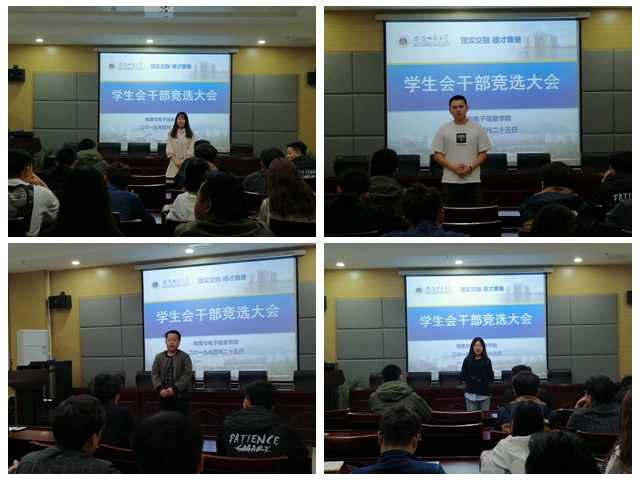 本网讯(院学生会 宣传部)4月25日晚,学院在335报告厅召开2019年学生会干部竞选大会。学院党委副书记黄友生、团委书记宋凤楼、学生会主席余亮以及2018届学生会全体骨干参加了会议。会议由宋凤楼主持。