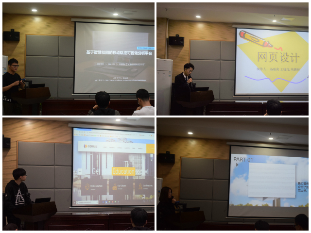 经过初赛选拔,共评选出5件作品进入决赛现场。主持人首先介绍了本次比赛的注意事项、活动规则及竞赛流程,随后,五组参赛队伍依次讲解演示。1号参赛作品是关于电协本身的网页设计,包含了电协所有部门的基本信息,并在网页上对各部们进行了详细介绍;2号参赛作品是将大格局的科技时代与电协本身相结合,突出强调“科技师大、科技电协”这个主题,并通过制作精美,科技感十足的PPT进行了详细的讲解;3号参赛作品是APP的设计,名为”智能生活“即“The smart life”。选手赵文浩对其作品进行了详细的介绍,其主要功能是记录个人的生活轨迹,了解个人生活情况。APP包括四个模块,分别为出勤轨迹记录、历史轨迹查询、在线数据可视化以及校园生活;4号和5号参赛作品都是关于网页设计,4号代表高鹏程言谈幽默、举止大方,5号代表宣洋言语温和、举止从容,都给现场观众留下了深刻印象。