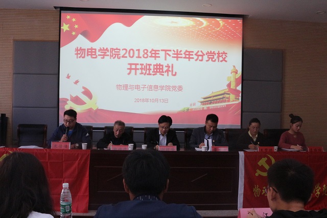 分党校在物理楼304会议室举行第6期学生党员培训班和第25期(校57期)入党积极分子培训班开班典礼。校党委组织部副部长、校党校常务副校长谢超峰,院党委副书记、分党校副校长黄友生,院关工委副主任、分党校指导老师陶绪德,院党委秘书王梦晓,培训班班主任米佳佳,副主任李琦琦以及71名预备党员和70名入党积极分子出席此次开班典礼。此次开办典礼由米佳佳主持。