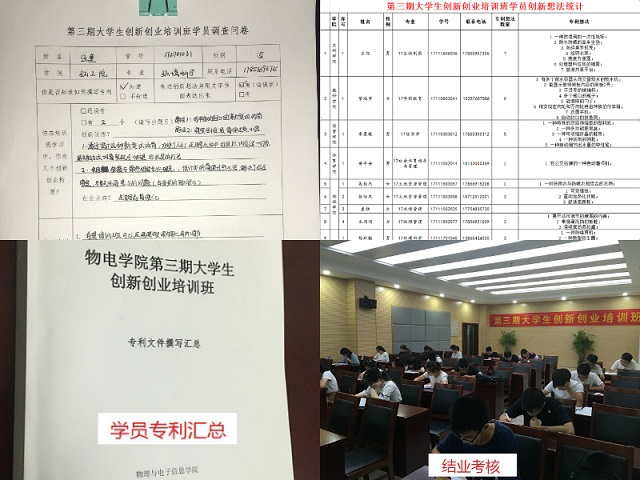 自2016年起尝试开展了大学生创新创业培训班,培训班以培养专业知识“精”、创新思维“活”、实践能力“强”的高素质创新型大学生为目标,以“培养创新意识,激发创造潜力,实践创新过程”为培养步骤,以创造学理论、创新方法、创新实践和创业指导为培训内容,以“每日一设想、每日一交流、每人一创新、每期一专利”为措施,七月份对学员进行强化培训,八月份学员自主学习与实践,九月份组织对学员进行结业考核后,培训班顺利结束并取得了良好成效。