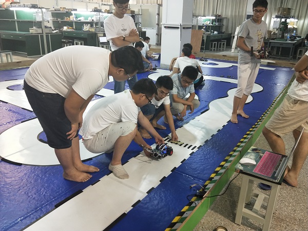 自十五日考试周结束,为筹备大赛便展开了紧张的智能车暑期社会实践,明确纪律,签到考勤,实训基地405灯光昼夜不息,从芯片设计到代码编辑,从电路焊接到车架拼装,赋予了无生趣的元件以奔驰的动力是困难的,但参赛选手决心用心血为智能车塑形,夜夜不倦,为之注入灵魂,使之得以进转回返,识别赛道并快速前进。