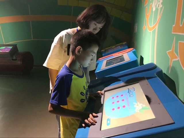 志愿者在向前来游玩的学生介绍科技馆展品的功能、科学原理以及操作方法