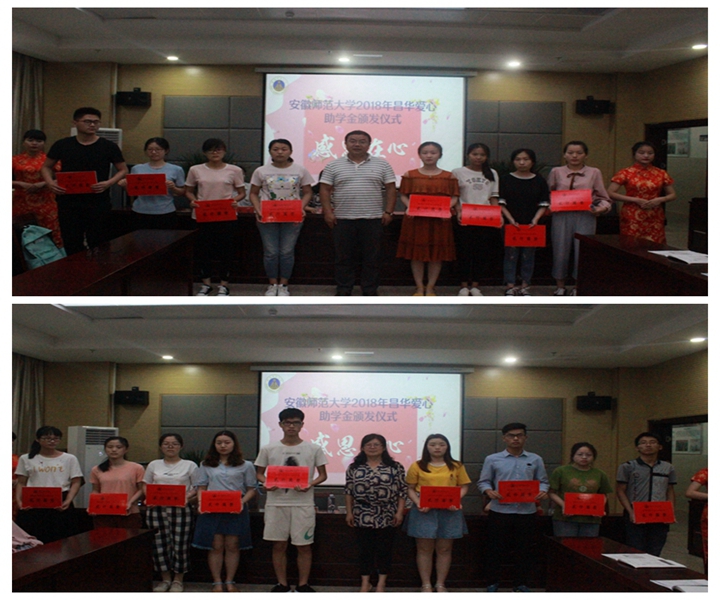 庄严的国歌声拉开了仪式的序幕,余妍霞宣读了《安徽师范大学教育基金会昌华爱心助学金的颁发决定》,并希望受助同学心怀感恩,努力学习,力争在未来的学习和生活中取得更大进步。宣读完毕后,史铁杰与李娟分别为两院受助学子颁发助学金并合影留念。