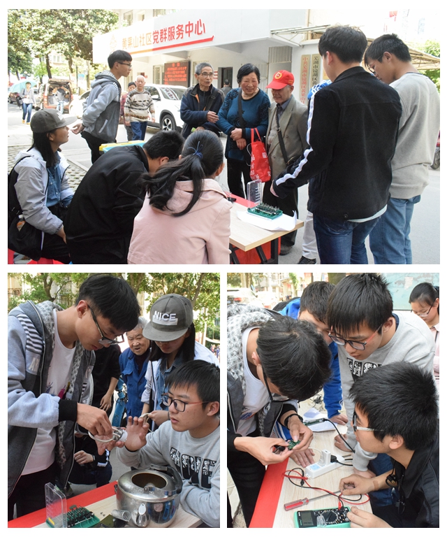 义务维修队伍刚到达黄果山社区,就接受到社区工作人员的热情接待。社区工作人员领着同学去往已经准备好的维修区域,并介绍社区的居民使用电器和需要需要维修的相关情况。到了工作台,还未等到同学把维修工具摆放到维修台,周围就已经挤满了社区居民。同学们合理分工,有条不紊。办公室成员负责接待前来维修的居民,并帮他们需要维修的电器登记整理;宣传部成员负责拍照,并向当地居民积极宣传我们的活动;创新部和电制部负责细致维修。小分队成员者们不慌不忙地分析检查电器的故障所在,进一步拆开电器外壳检查内部电路,然后用万用表仔细地测量每一条线路,细心分析,逐步故障原因后找到问题所在,进而合理维修。小分队成员们观察仔细,分析问题沉着冷静,善于合作,找到问题所在后,大家就一起动手焊接线路或调整机械机构。