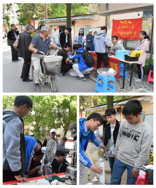 科技创新盛宴,决定开展“迎雷锋”家电义务维修活动。4月18日中午,电子爱好者协会义务维修小分队在物理楼集合完毕,前往芜湖市黄果山社区进行义务维修活动。此次队伍由创新部副部长毕健、韩梦婷,科技部副部长钱佳佳,电制部副部李紫薇共同带队。