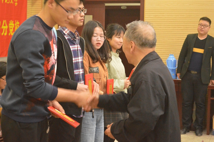 随后,上期培训班学员优秀代表陈韫璐同学进行发言。他从理论课堂、微型党课、实践活动三个方面向大家分享了自己的学习心得体会,“组织上入党只有一次,思想上入党需要一生一世”,陈韫璐同学用这句话告诉我们要时时刻刻用党员的标准严格要求自己,发挥先锋模范带头作用。接着上期培训班四位优秀学员代表上台领奖,学院领导李娟和吴长义分别为本期培训班学生代表发放党员领航本和听课笔记本。典礼上,本期优秀学员代表张翔同学上台发言,首先他代表全体学员感谢学院提供这次学习机会,并承诺将以最饱满的热情,最全面的投入和最实际的行动来完成党校的学习。严格遵守纪律,注重理论与实践相结合,主动向党组织靠拢,争取早日成为一名优秀的共产党员。