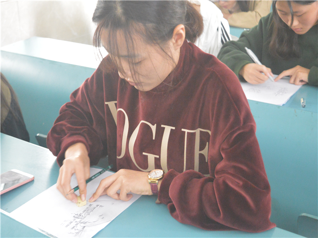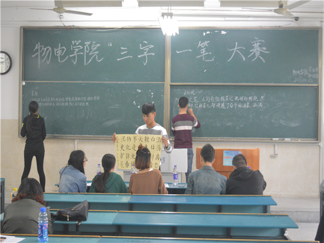 比赛共分为钢笔字、毛笔字、粉笔字、简笔画四个模块。在钢笔字比赛中,同学们一撇一捺的认真书写,有的苍劲有力,有的绵柔含蓄,有的则将刚与柔完美结合,充分展示了汉字的独特美。毛笔字会场中,选手们舞文泼墨,挥洒自如,百变的笔风,十足的创意,佳作接连不断。粉笔字考验的是师范类学生的基本功,只见选手们在黑板上洋洋洒洒,各式字体层出不穷,一面普通的黑板瞬间变得活力十足。而画简笔画的选手一直专心致志的伏案描绘,多才多艺的同学们仿佛个个化身马良,一个简单的动漫人物也能被他们画的熠熠生辉,生动传神。据悉,此次比赛共有三个年级150余人参加,获得最终优胜的4名选手将选入校选进行最后一轮角逐。
