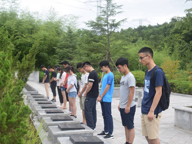16光电的12名小伙伴六安实践小队于中午从六安各处集合于张家店烈士陵园,在一段时间步行,享受着一路的美景,蝉鸣,微风,来到了我们的目的地,张家店烈士陵园。走进烈士陵园,我们首先看见了巨大的纪念碑,上面写着大大的八一二字,并在其后又一个金色的星星,体现出我国军队的威严,巨大的纪念碑也体现出我国对先烈们的尊敬。纪念碑后面则是当年部分革命先烈的墓,想着其中埋葬着革命的先烈,我们的内心就升起了敬意,这敬意使我们在先烈的墓前驻足,默哀,以我们的方式向先烈们表达我们的敬意,并观赏了一番先烈陵园的美丽景色。