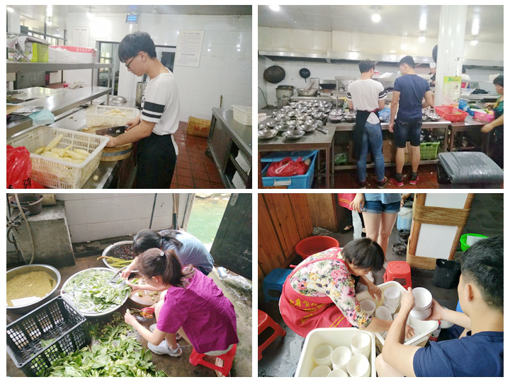 16自动化一小支队伍前往黄山芙蓉谷,经餐厅经理的安排,我们被分配到芙蓉谷餐饮部进行志愿劳动,8:00大家准时到场,跟着厨房阿姨后面帮忙干活,虽然有些辛苦,但大家并没有怨言,勤勤恳恳的工作着,到了11:30大家准时就餐,中午稍作休息后,下午3:00又开始进行劳动。