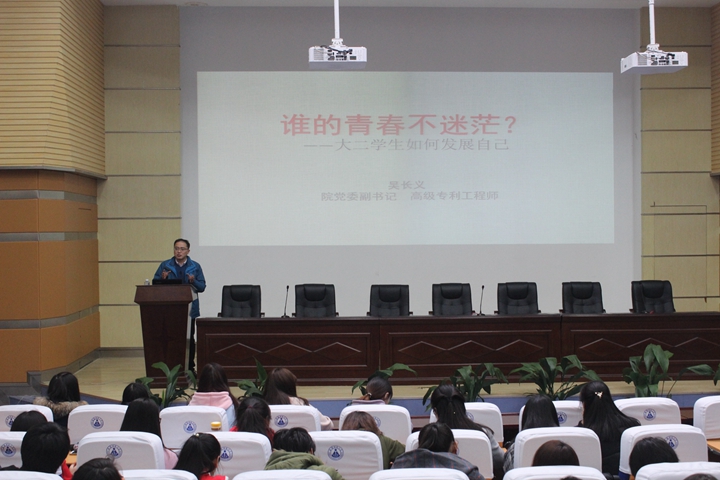 党委副书记吴长义在赭山校区科技小礼堂举行“谁的青春不迷茫”专题报告会。报告由学院团委副书记米佳佳主持,全体2015级近400名学生共同聆听了报告会。