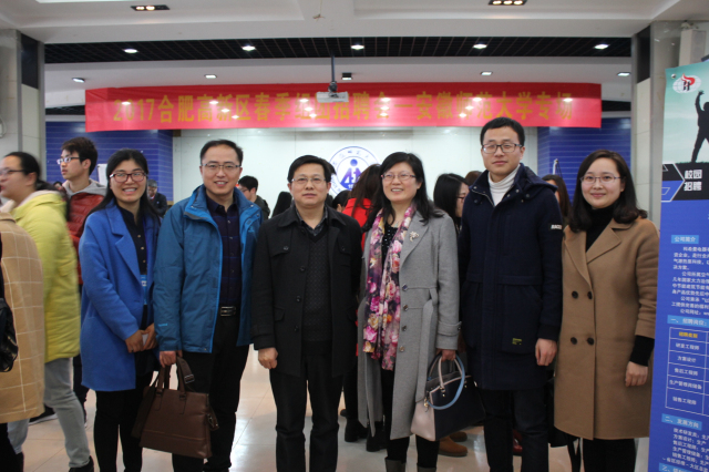 联合合肥高新区人才服务中心在花津校区二楼招聘大厅举办2017届毕业生春季大型招聘会。学生处处长台启权、院党委书记李娟、副书记吴长义、学生处就业指导中心主任崔玉凤、毕业班辅导员深入招聘会现场指导工作。