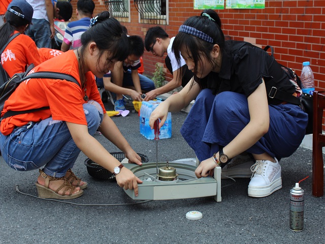 次日义务维修团队将温暖传递到了香苑社区,有了在金湾社区的经验团队的维修工作开展的十分迅速,维修队员们立刻投入了电器的维修中。由于场地有限,大多数的维修人员只能蹲在地上维修电器,遇到有些难以维修的物件,大家就会围在一起讨论,或者向学长请教。经过这次的义务维修,整个团队的关系更为融洽。