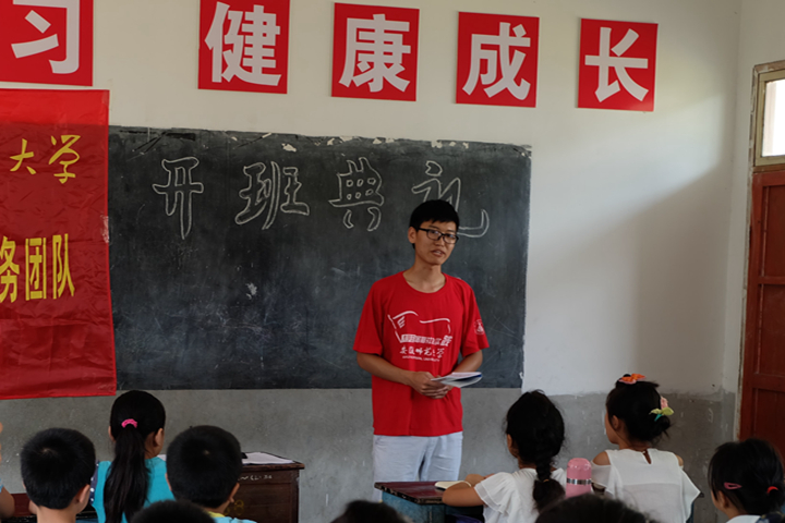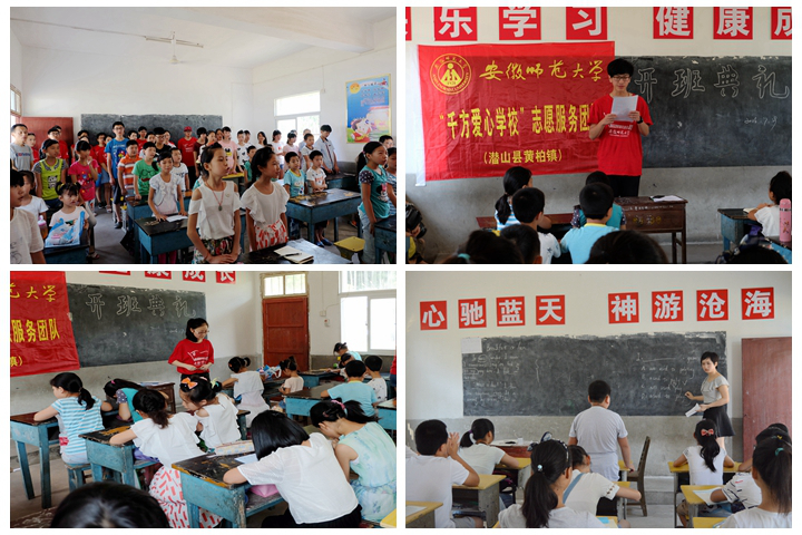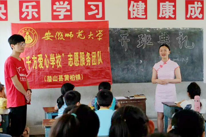 赴潜山县黄柏镇义务支教团队在昆仑小学举行“千方爱心学校”暑期义务支教开班典礼。与会人员有昆仑村支部书记杨晓东、团队指导老师秦瑾琼、全体暑期实践团队队员及全体学生,典礼由丁飞杨主持。