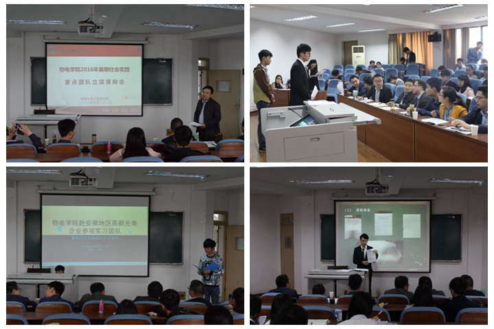 在综合楼三楼会议室召开了2016年暑期社会实践团队项目答辩会。院党委副书记吴长义、物理学学科教学教研室主任汪志荣、院团委书记米佳佳及全体辅导员老师担任答辩会评委,学院32支本科生和研究生团队参与答辩。