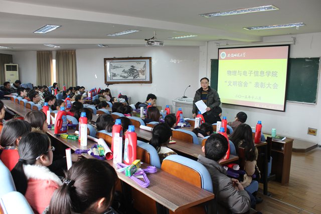 徐玲首先结合学院在“文明寝室”创建工作中取得的成果和经验,向大家介绍了学生寝室管理工作的重要意义,重点对寝室民主生活会进行了布置和强调,接着,她对2015—2016学年第一学期宿舍卫生检查结果进行了通报,指出学院在以后的工作中将继续加大寝室管理力度,重点培养学生自我管理的意识与能力。在徐玲向大家介绍了“文明寝室”的评选过程和准则后,大会对上学年获评的11个“文明寝室标兵”和22个“文明寝室”进行了表彰,吴长义以及各位辅导员依次为获得表彰的寝室颁发了奖品。