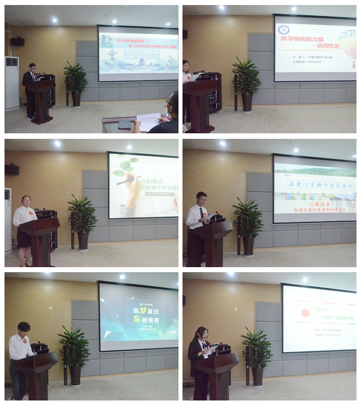 汇报会上,14名同学按照抽签顺序依次上台进行PPT汇报。他们中有暑期积极参加各类国家级、省级学科竞赛,为师大、学院争得荣誉的竞赛精英;有把阅读当成一种习惯,在书海遨游、汲取养分,提升人文素养的理工科“书霸”;有感恩父母、回报母校,贡献青春力量的孝亲模范;有矢志教育、自制教具、创设课堂的师范标兵。六个方面的事迹各有特色,但无不诠释着师大学子自强不息、积极进取、知行合一的优良品质。现场气氛热烈,掌声不断。