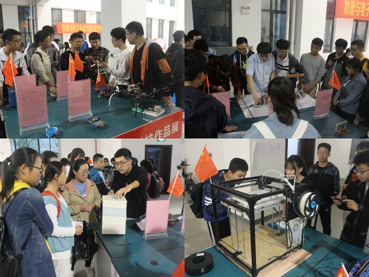 在高年级学生骨干的带领下,各班级分批次有序进入展区。作品展分为两大部分,第一部分为物电学子各类优秀科技创新作品交流区,展示的作品主要包括工科类智能储物系统、基于STM32的多功能手表、机械臂等;理科类机械能守恒演示仪,探究变压器匝数与电压关系演示仪等以及各类优秀已授权的专利作品。每个展台前人头攒动,高年级优秀学生代表为新生进行通俗化讲解、实验演示、互动体验,让新生们更加切实的体验到科技制作的魅力。第二部分则为智能车、四轴飞行器以及双人舞蹈机器人展示区。学生骨干积极展示智能车的自动识别道路行驶以及飞行器轨迹控制,充分展现出在学院培养下物电学子的优秀科技创新和实践能力。