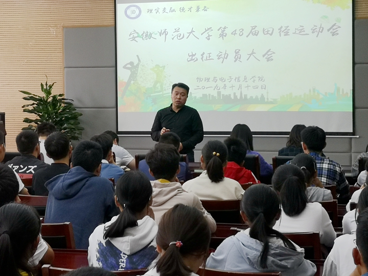 新媒体中心)10月14日中午,学院在物理楼304报告厅召开校第48届田径运动会出征动员大会。院党委副书记黄友生、团委书记宋凤楼、全体专兼职辅导员、运动员代表以及学生会工作人员参加大会。会议由学生会副主席丁臻主持。