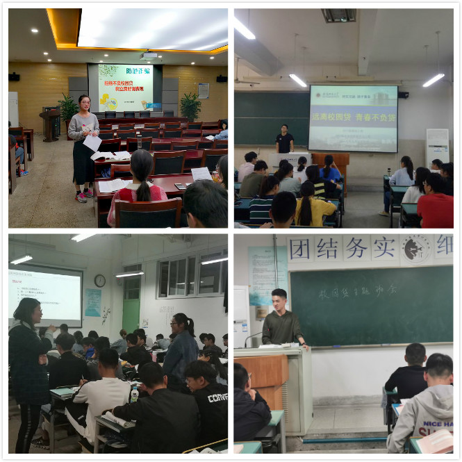 “校园贷、套路贷”风险告知书》,普及金融信贷和网络安全知识。各班级积极组织召开主题班会,宣传不良网络借贷相关法律法规,强化学生理解和认识。主题班会形式多样、内容丰富,通过播放专题警示片加深同学们对其危害的印象,通过案例分析和研讨帮助同学们认识不良校园贷产生的原因,通过主题发言引导学生树立正确的消费意识,提升网络安全防范意识。