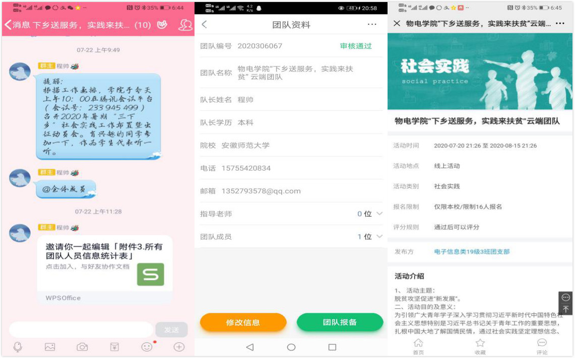 “下乡送服务,实践来扶贫”云端团队,并招募队员。经过初期准备活动,团队成员进行了有效分组,并为各小组合理分配任务,积极践行人人献力的实践理念。经过团队成员的沟通与讨论,考虑到疫情与每个人当下所处位置关系,团队确定了“下乡送服务”的实践主题,并决定从实地调研、服务三农、美化乡村环境等方面展开活动。