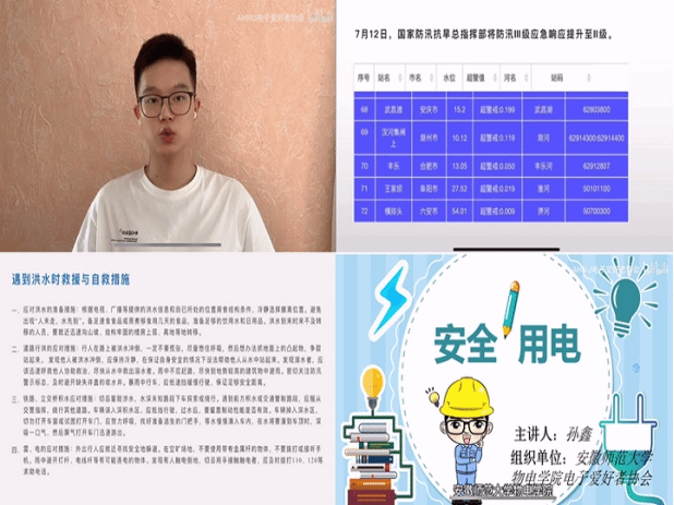 自七月以来汛期严重,多地受到洪涝灾害的影响。电子爱好者协会云科普团队通过制作相关抗洪救灾的科普视频支援防洪防汛工作,自八月以来,“防洪防汛云宣讲”系列视频陆续推出。在这三则防洪防汛视频中,董新龙同学由浅入深地讲解了有关洪涝灾害的知识。由其危害讲到我国汛期的成因和时间,还从地理因素解释了安徽为何连年洪涝,并介绍了我国的暴雨预警系统,告诉观众们各级预警时应该做到哪些事,最后就如何再洪水中开展自救展开宣讲。云科普团队以科普视频形式支援防洪防汛工作,从而实现以科普展现青年力量。与此同时,适逢夏季高温天气,云科普团队又推出了“安全用电”系列科普视频,孙鑫同学为大家讲解了用电安全知识,强化观众们的安全意识。