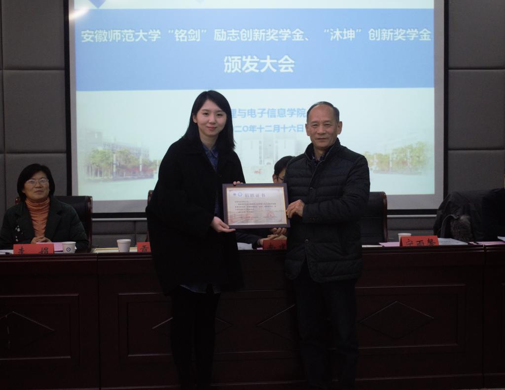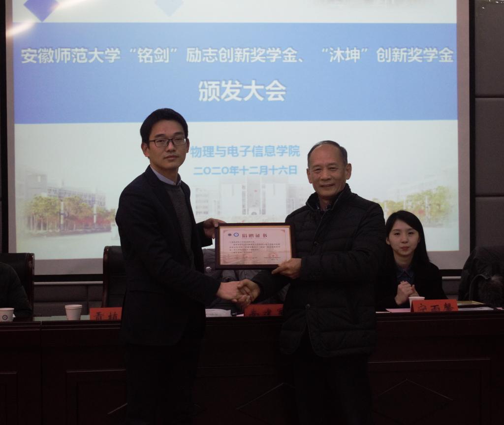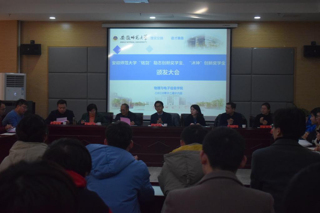 “思源”爱心基金第一届“铭剑”励志创新奖学金、第二届“沐坤”创新奖学金颁发大会在物理楼335报告厅举行。上海铭剑电子科技有限公司总经理南建军、合肥沐坤科技有限公司董事长助理宁雨馨、苏州伏波电子科技有限公司公司常务副总经理黄聪、人力资源部部长沈嘉维、校教育基金会秘书长贡植斌、无翼鸟