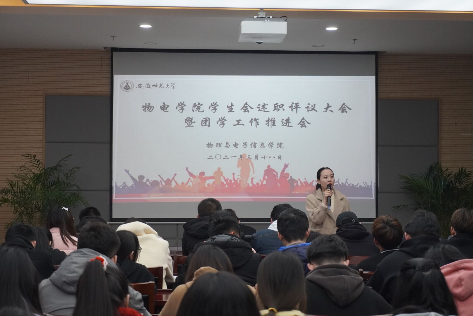 2020-2021学年学生会述职评议大会暨团学工作推进会于物理楼304报告厅举办。院团委负责老师刘冠琪、大学生物理爱好者协会指导老师邹孝龙、校学生会主席团成员王玥出席本次会议。学院20级各班班长、班委代表以及学院五大团学组织代表参加本次评议会。会议由院团委学生副书记李浩主持。