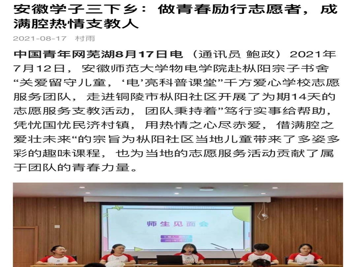 【2021青春三下乡】中国青年网以《安徽学子三下乡:做青春励行志愿者,成满腔热情支教人》为题报道无翼鸟