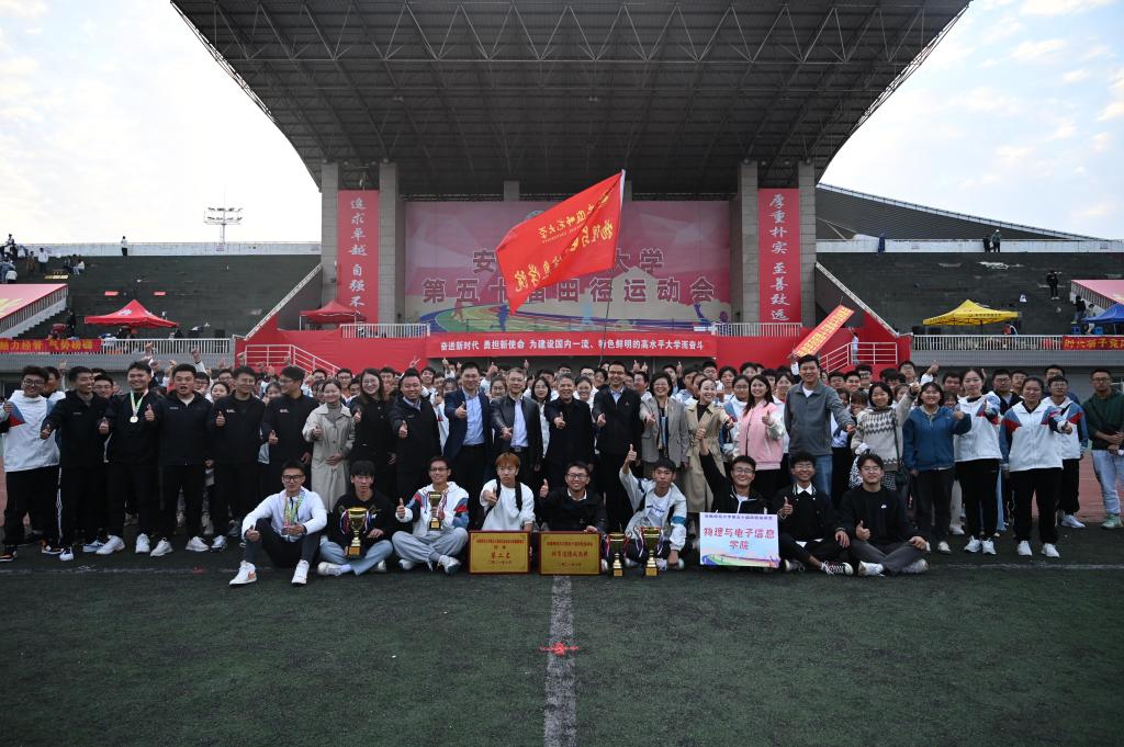 李浩 吴佳怡)完善人格,首在体育!10月21日至23日,安徽师范大学第50届田径运动会在花津校区北体育场顺利举行。物电师生再创佳绩,其中男子甲组获团体总分第一名,蝉联“五连冠”;女子甲组获团体总分第五名;男女甲组总积分第一名;男女体质健康测试团体第二名;教职工总成绩第三名。运动场上学院师生顽强拼搏、奋勇争先,展现了物电师生良好的精神风貌,学院荣获道德风尚奖。