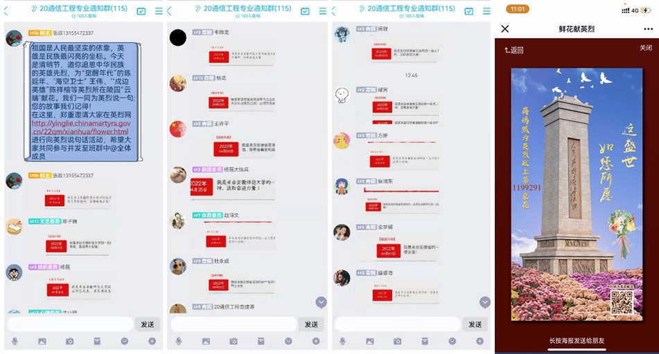 清明节当天,学院组织了形式多样的网上祭扫活动。学院团员青年积极参加中华英烈网“青年祭英烈”专栏以“2022奋进:传承英烈精神,奋进伟大进程 ”为主题的网上祭扫英烈活动,运用“敬献花篮”和“我向英烈说句话”等途径缅怀革命烈士们。同学们通过线上观看人民日报“清明祭英烈”直播平台学习革命英烈故事,不少学子观后在线上发表个人感言。学院其他班级团支部亦围绕主题采用大学生喜闻乐见的形式,认真开展了“纸鸢寄相思,清明怀故人”、“讲好英烈故事,传承红色基因”、“强健我体魄,砥砺我心志”、“清明祭英烈,观影铭党恩”等团日活动。
