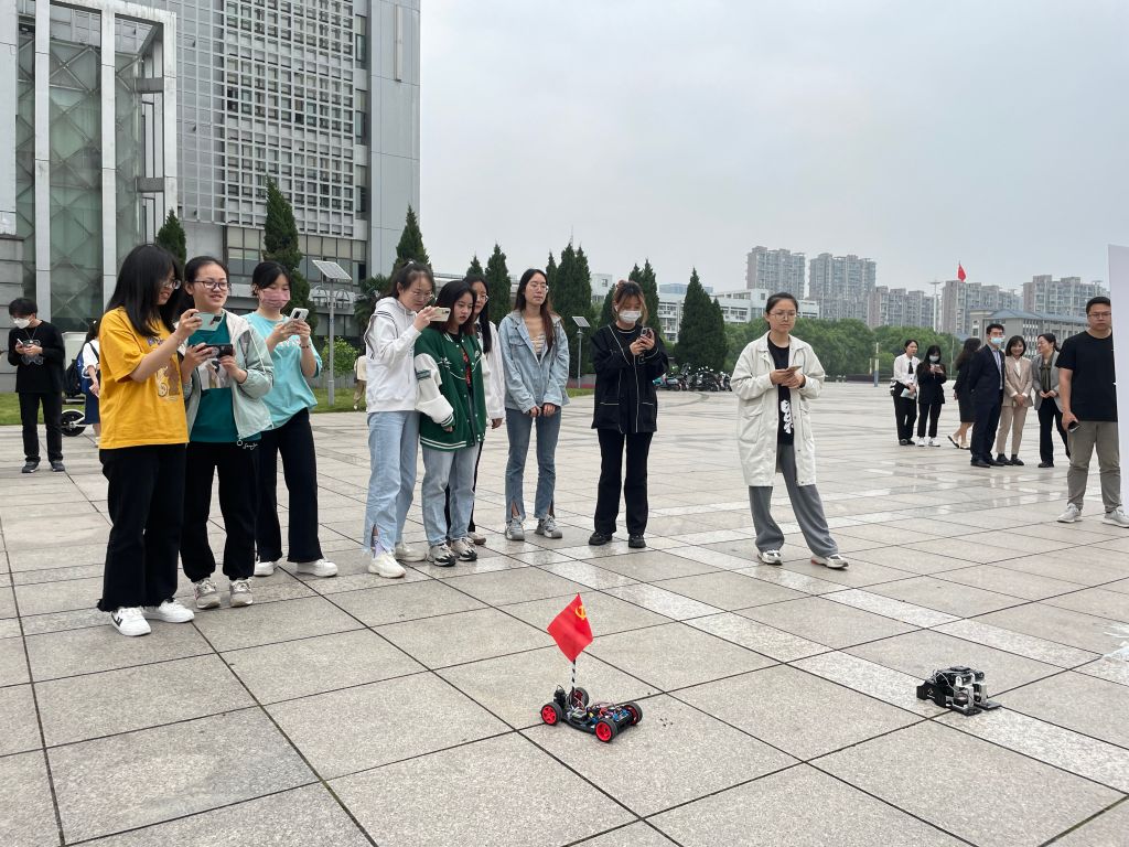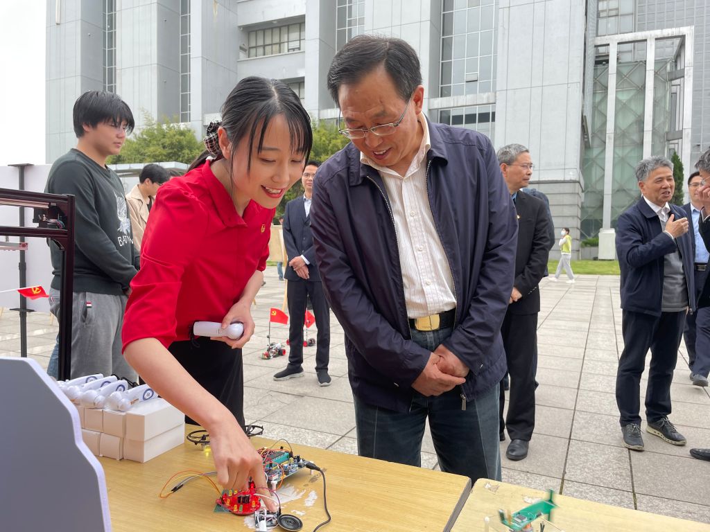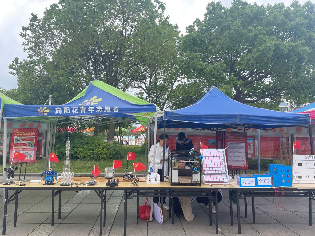 活动现场展示主要包括四旋翼、智能车、光立方、3D打印机等作品。其中,电子爱好者协会的舞蹈机器人在原创代码驱动下,根据《党是太阳,我是花》歌曲音乐律动自动挥舞身体躯干,吸引了大批同学的驻足;学科竞赛团队以创造创新为目的、自主设计和研发出的能制作智能车、四旋翼等电子设计作品的3D打印机,在现场逐层打印出“建团百年”的立体模型,让科技作品迸发出红色教育的新风采;2019级张哲川创作的远距离输电演示仪通过学生电源、可拆式变压器、小灯泡模拟出实际生活中的发电站、变压器以及家庭用电,该作品已获得安徽省双百大赛二等奖,该同学立志扎根祖国乡村,他表示制作教具的过程虽然辛苦,但是以赛促学,帮助了他扎实理论知识、练就师范生技能,有助于以后为偏远地区的孩子们带去更多科学之光;51单片机diy电路经过志愿者的演示讲解,为老师同学们依次呈现出团徽、红心、1922-2022年等图样,完全实现了录音播音等多样功能,将青春的头脑风暴与科普的成果展示有机结合,让作品既有科技底蕴,也有育人内涵。活动现场气氛热烈,一件件“铁萌”的科普展品,一段段“硬核”的精彩演示,吸引了众多学生和老师观看,科技作品的魅力无限散发,强国志报国行的信念入脑人心。