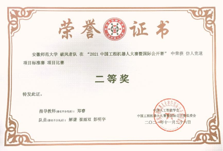 三年以来,解谦十分注重对自身综合实践能力的培养,多次在国家级和省部级A类竞赛中获得优异成绩。现阶段,累计获得国家级奖项7项,省级奖项10余项,校级院级奖项20余项的优异成绩,他曾在校创建“破风者”创新实践团队,并带领团队参加“全国大学生智能汽车竞赛”。该团队在2019年暑期与众多高校在全国总决赛的赛场上同台竞技,并最终斩获第十四届全国大学生智能汽车竞赛国家级二等奖(全国次高奖项),破我校同年级历史最好记录。2021年,解谦以个人形式参加了“蓝桥杯”全国软件与信息技术专业人才大赛。比赛中不乏国防科大等知名强校,经过三个多月的备战,他以小组第二的成绩成功晋级全国总决赛,并最终摘得国家级奖项,实现了学院在该项赛事国家级奖项“零”的突破。2022年暑期,解谦带领“破风者”团队参加中国工程机器人大赛暨国际公开赛,与清华、北大、东南、哈工大等传统强校同台竞技,这也是我校历史上首次实现走上全国乃至国际机器人竞赛,最终在全国总决赛的赛场上斩获国家级二等奖的优异成绩。