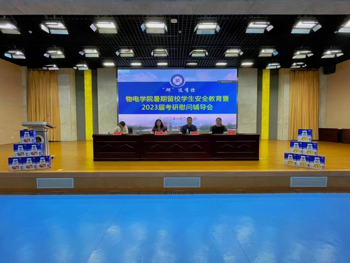 在理化大楼报告厅开展暑期留校学生安全教育暨2023届“研”途有你考研慰问辅导会。学院党委书记李娟,党委副书记黄友生,副院长宁利新、张爱清,全体专兼职辅导员以及全体留校本科生、研究生参加会议。会议由辅导员刘燕主持。