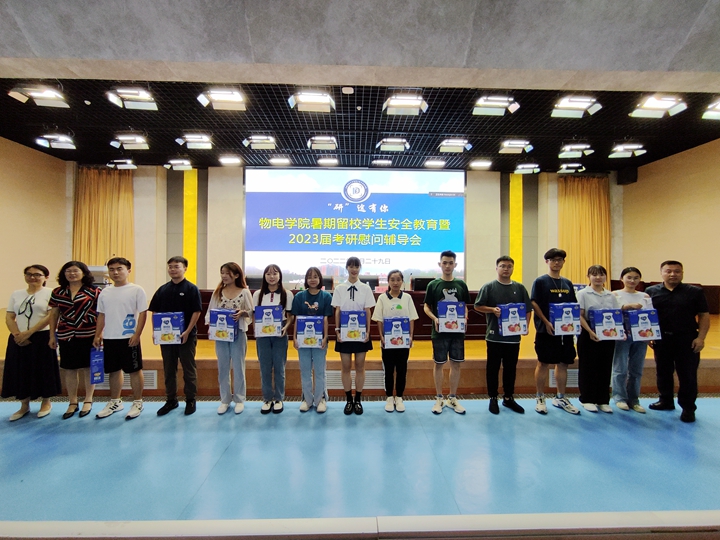 李娟在总结讲话中希望全体留校学生要珍惜留校机会,珍惜学校、学院提供的暑期条件,认真学习和科研;要严守规章制度,遵守学校的各项管理规定;要高度重视安全,要始终把安全放在首位,当好安全第一责任人。她希望考研学子要有合作,与“研”友相互扶持、资源共享;要有目标,要学会科学择校、避免扎堆;要有坚持,不能半途而废,要一站到底。会后,全体领导老师为学生代表颁发考研慰问品并合影留念。