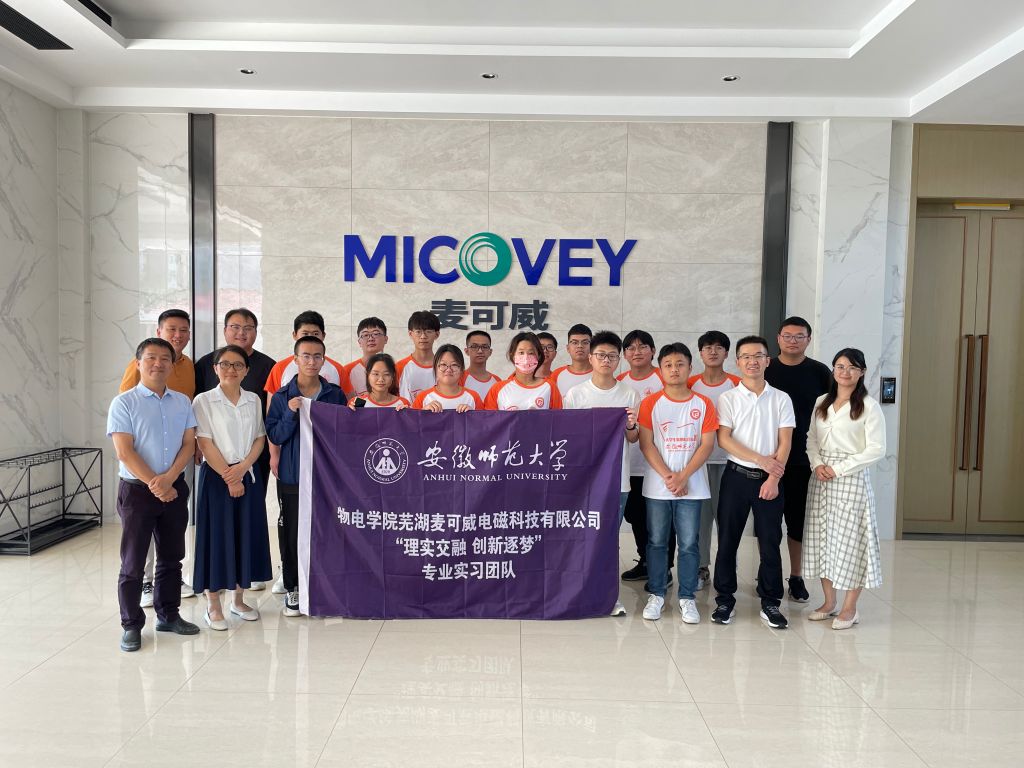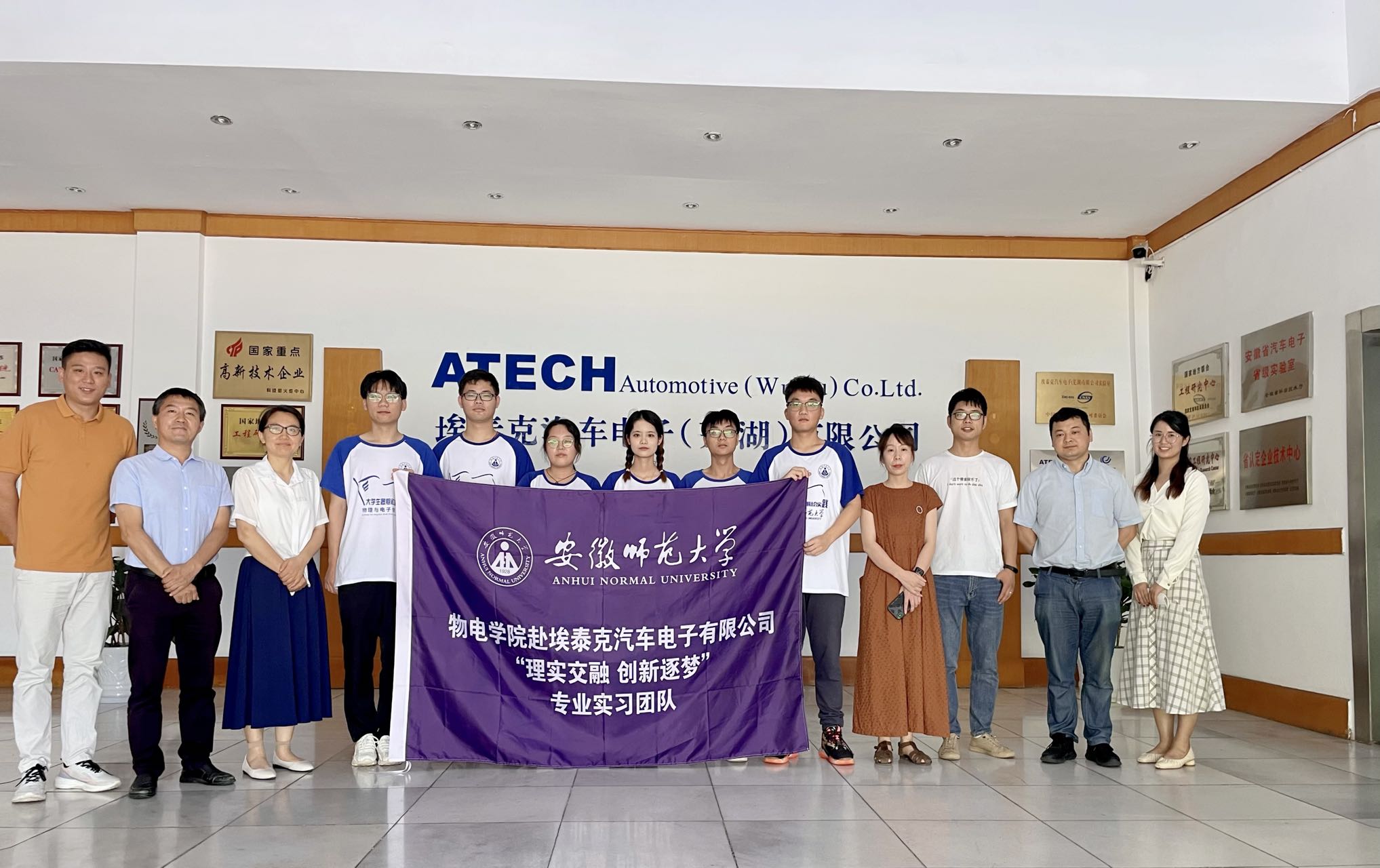 “理实交融,创新逐梦”赴芜湖市企业专业实习团队。埃泰克汽车电子有限公司研发硬件部总监程敬晔、安徽师范大学校友、总工助理李祥、软件部经理郭雅杰、人事部经理侯晶晶和麦可威电磁科技有限公司人事总监王敏等热情接待张爱清一行。