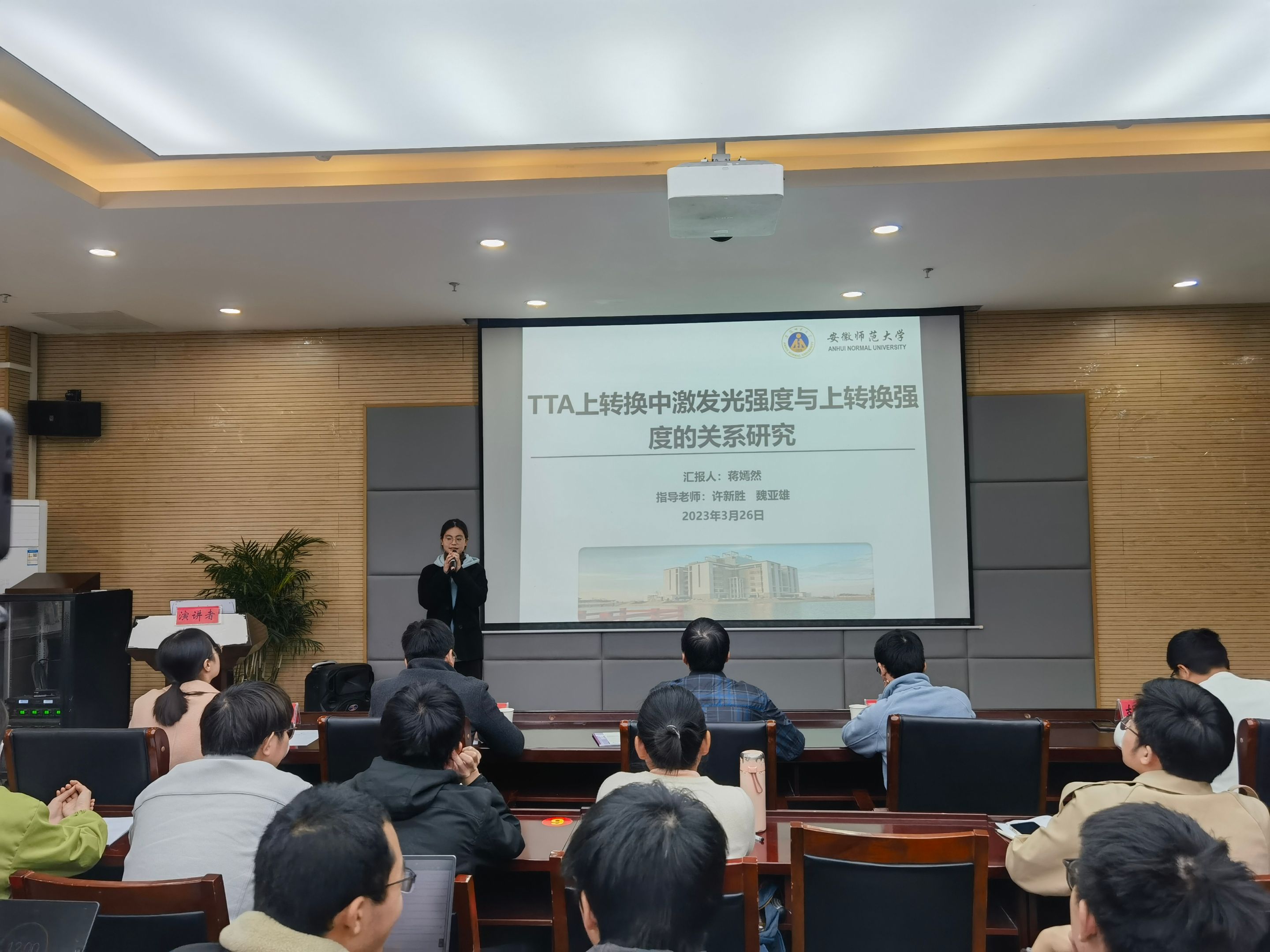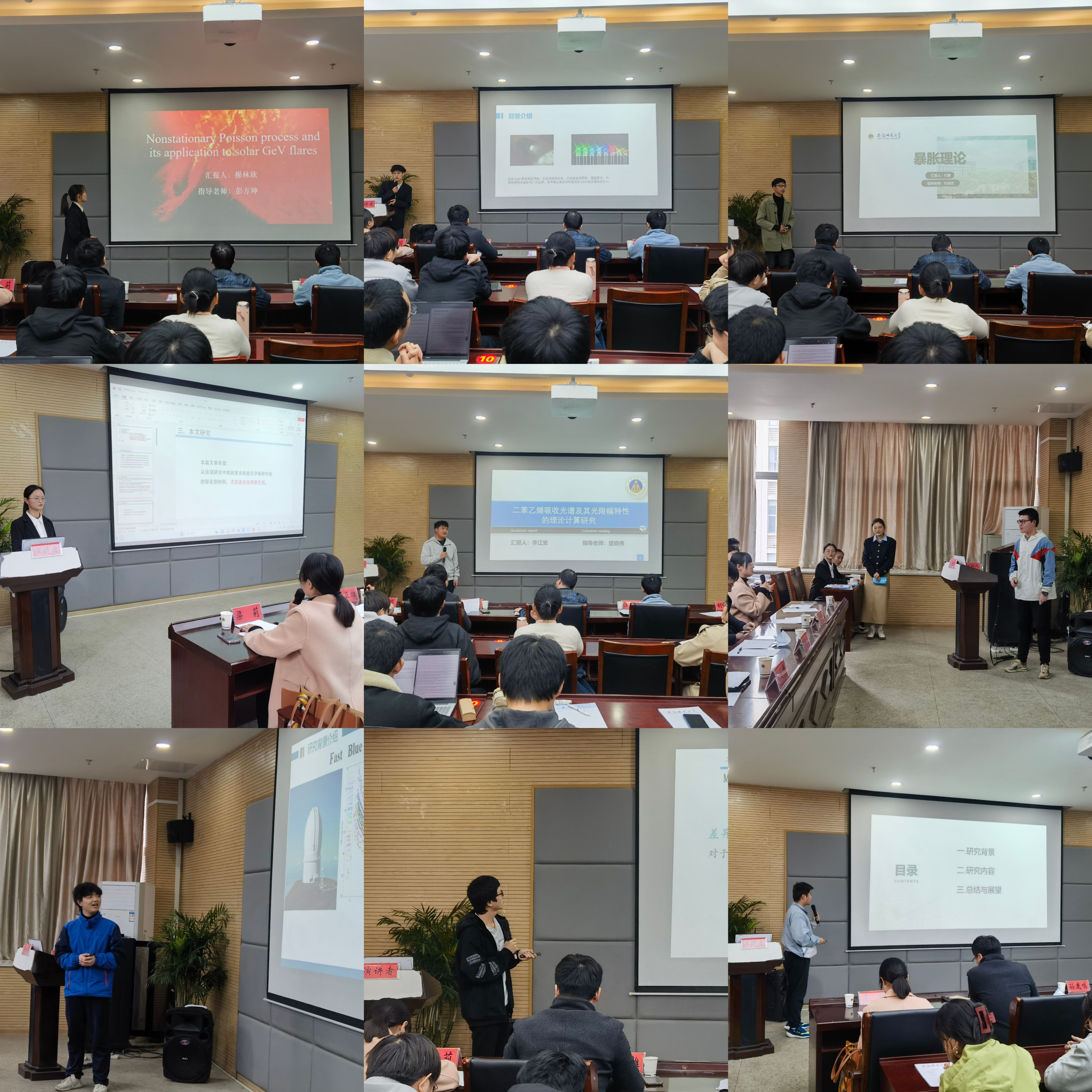 此次比赛通过现场汇报、师生提问、评委点评的方式进行。10位选手依次展示了自己的科研训练成果。其中操林欣同学以《Nonstationary Poisson process and its application in solar GeV flares》为题进行了汇报,蒋嫣然同学以《TTA上转换中激光发光强度与上转换强度的研究》进行了汇报,李江安同学对二苯乙烯吸收光谱及其光限幅特性的理论计算进行详细讲解等等。同学们的精彩汇报使得报告会场学术氛围十分浓厚。