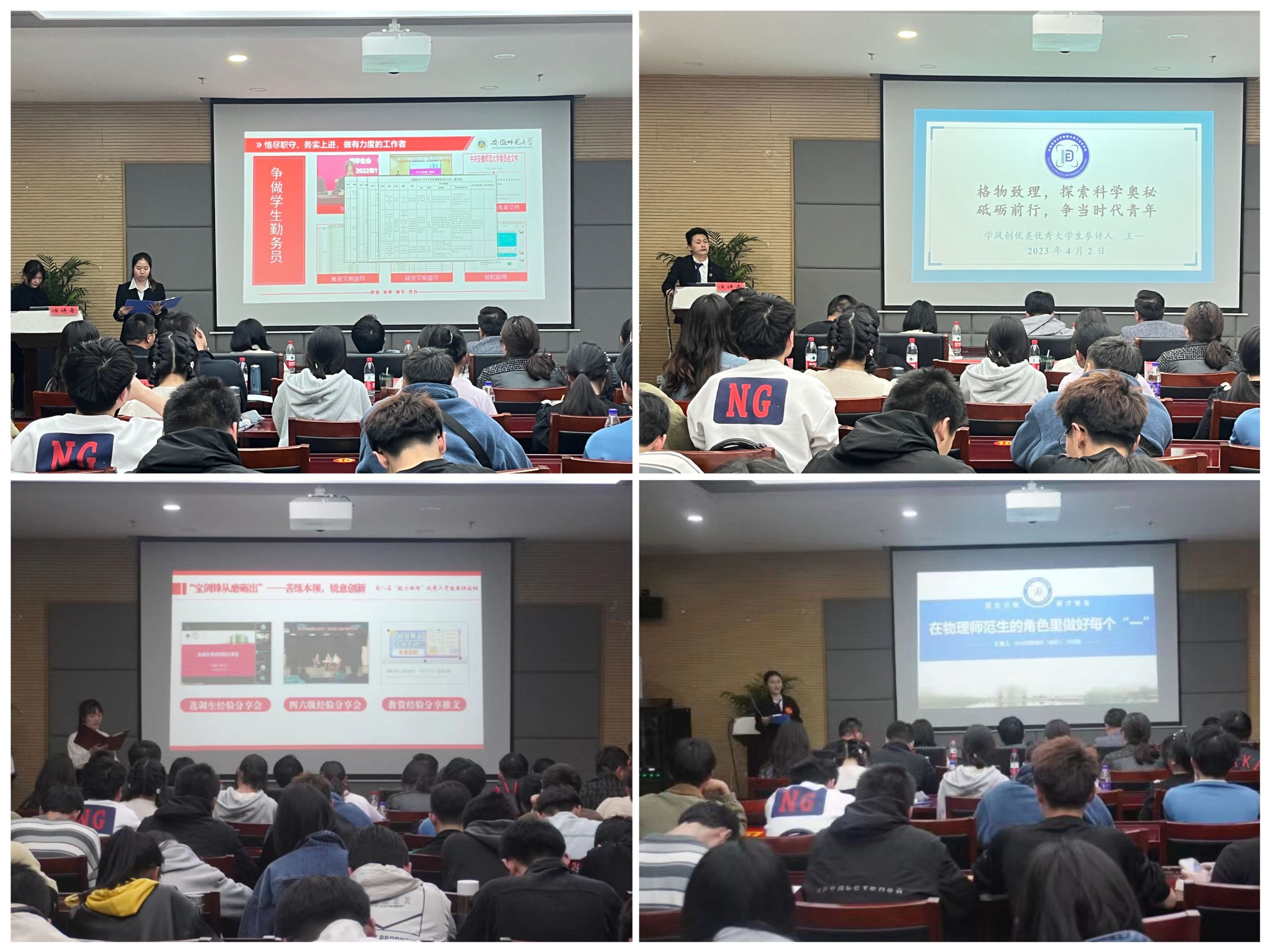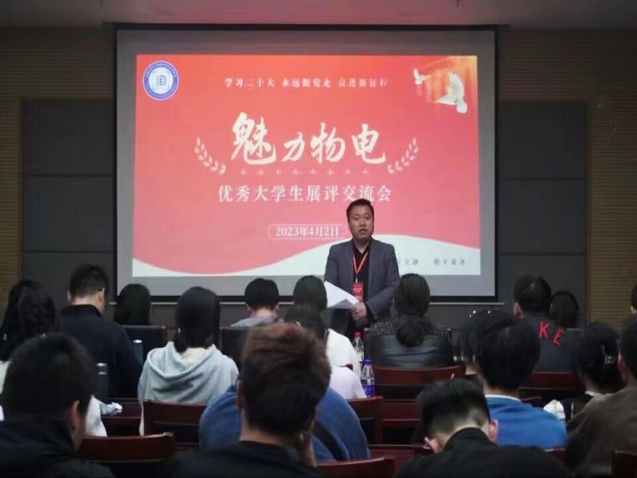举办第八届“魅力物电”优秀大学生展评交流会。学院党委副书记黄友生,物理学专业负责人吕建平,专业教师王桂丽、杨凌云、胡长生及学院全体专兼职辅导员参加活动并担任评委,2021级、2022级部分学生代表到场参会观摩学习,2022级学生王紫怡主持活动。