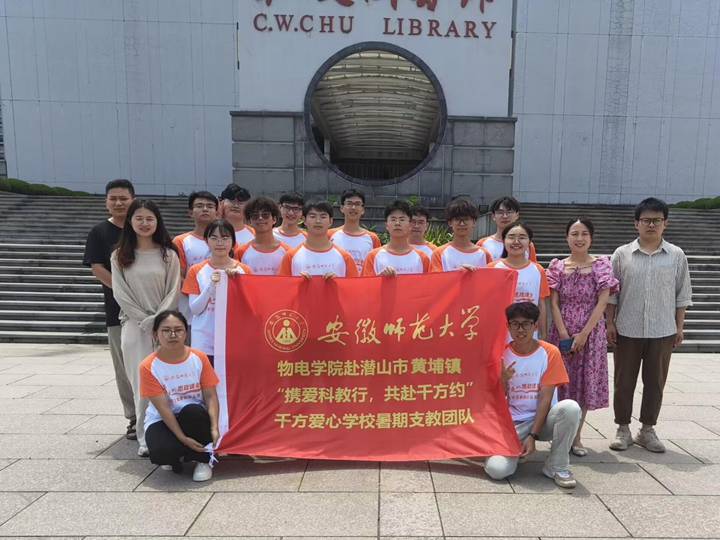 赴潜山市黄铺镇“携爱科教行,共赴千方约”千方爱心学校暑期宣传调研团队全体成员齐聚敬文图书馆门前。自2006年,安徽师范大学05级物理学本科生杨千方组建团队以来,这是安师大学生第18年走进潜山,他们冒着酷暑,走过山路,接过学长的接力棒,将科学,卫生,文化带进潜山的贫困山区。