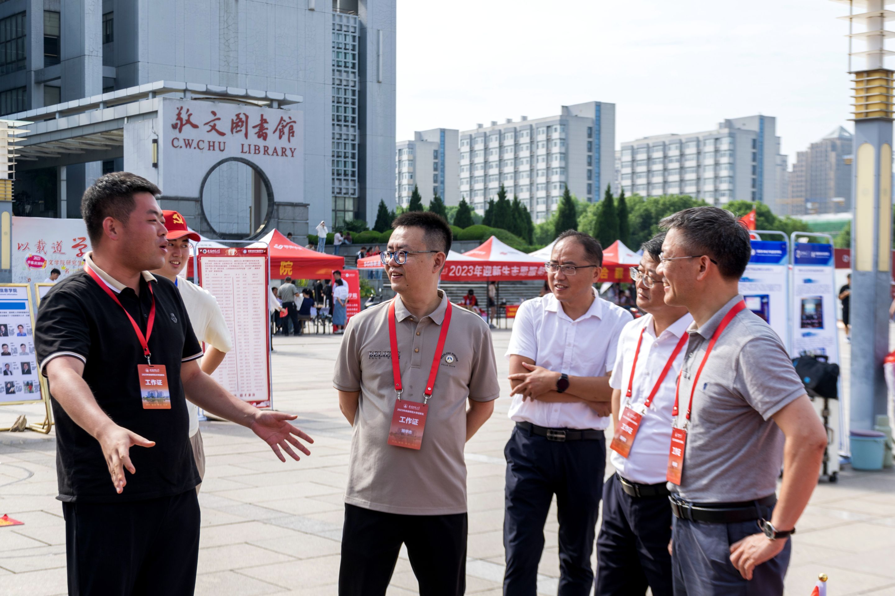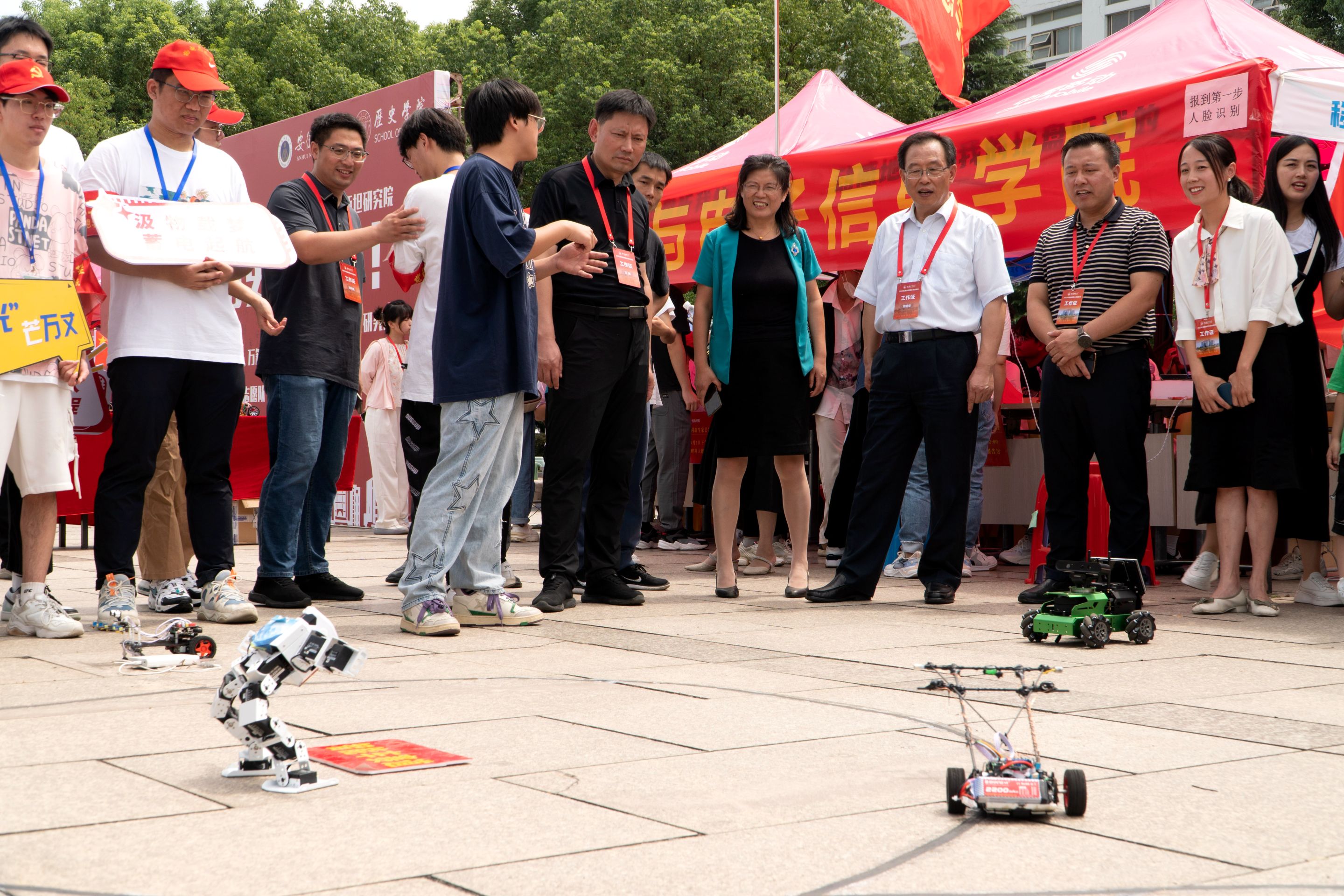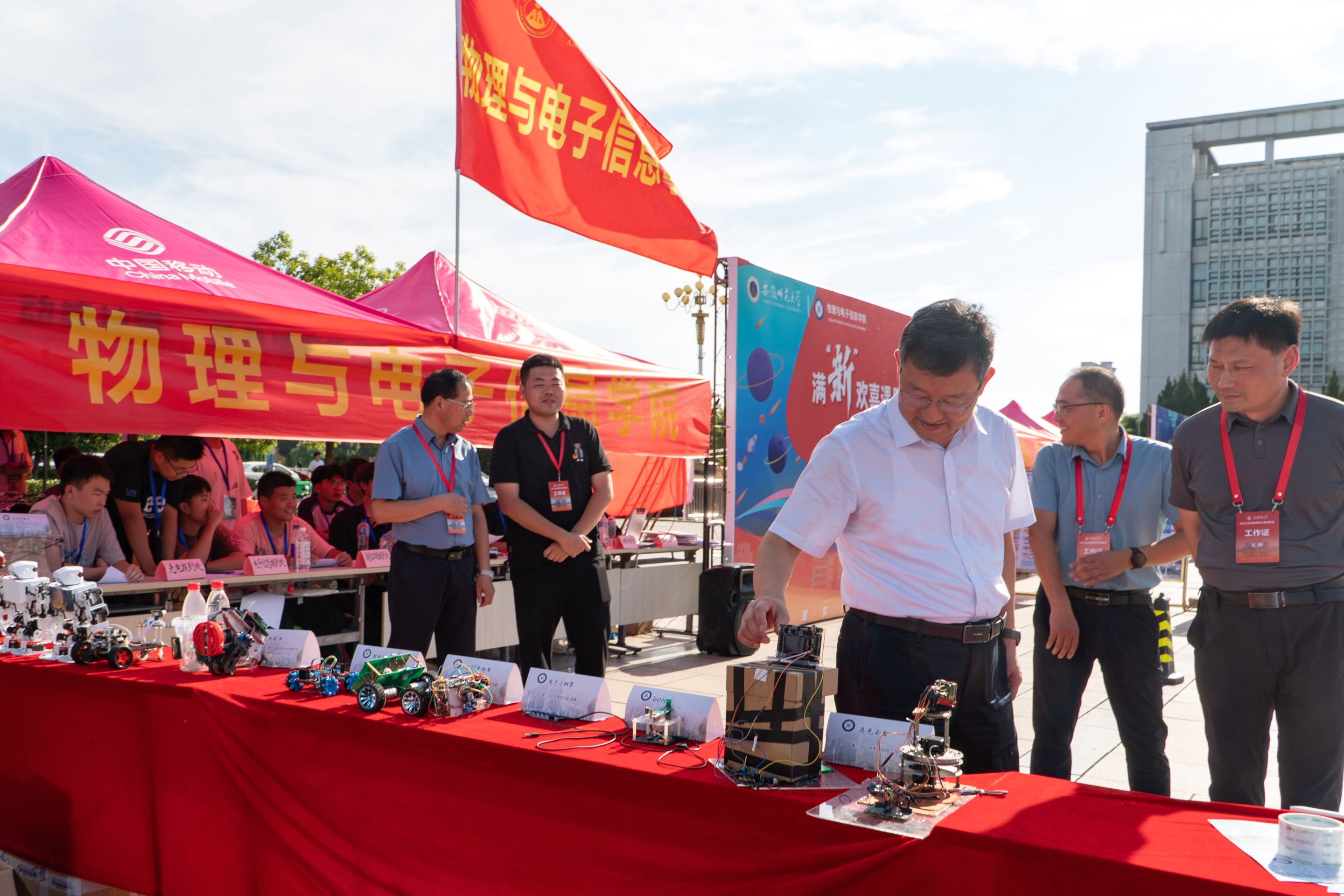 迎新现场,一列展台上展示着物电学子制作的科技作品,从工科学生研制能歌善舞的机器人、风驰电掣的智能汽车到物理师范生自制的磁感应强度探究仪、法拉第电磁感应定律演示仪、共振现象演示仪等物理教具,通过学生志愿者专业演示与讲解,让新生们在展览中感受学科魅力,对自己专业有了进一步认识。此外,学院学团组织简介、育人品牌项目、2023届考研光荣榜等宣传内容也在潜移默化中让专业思想教育加深加固。