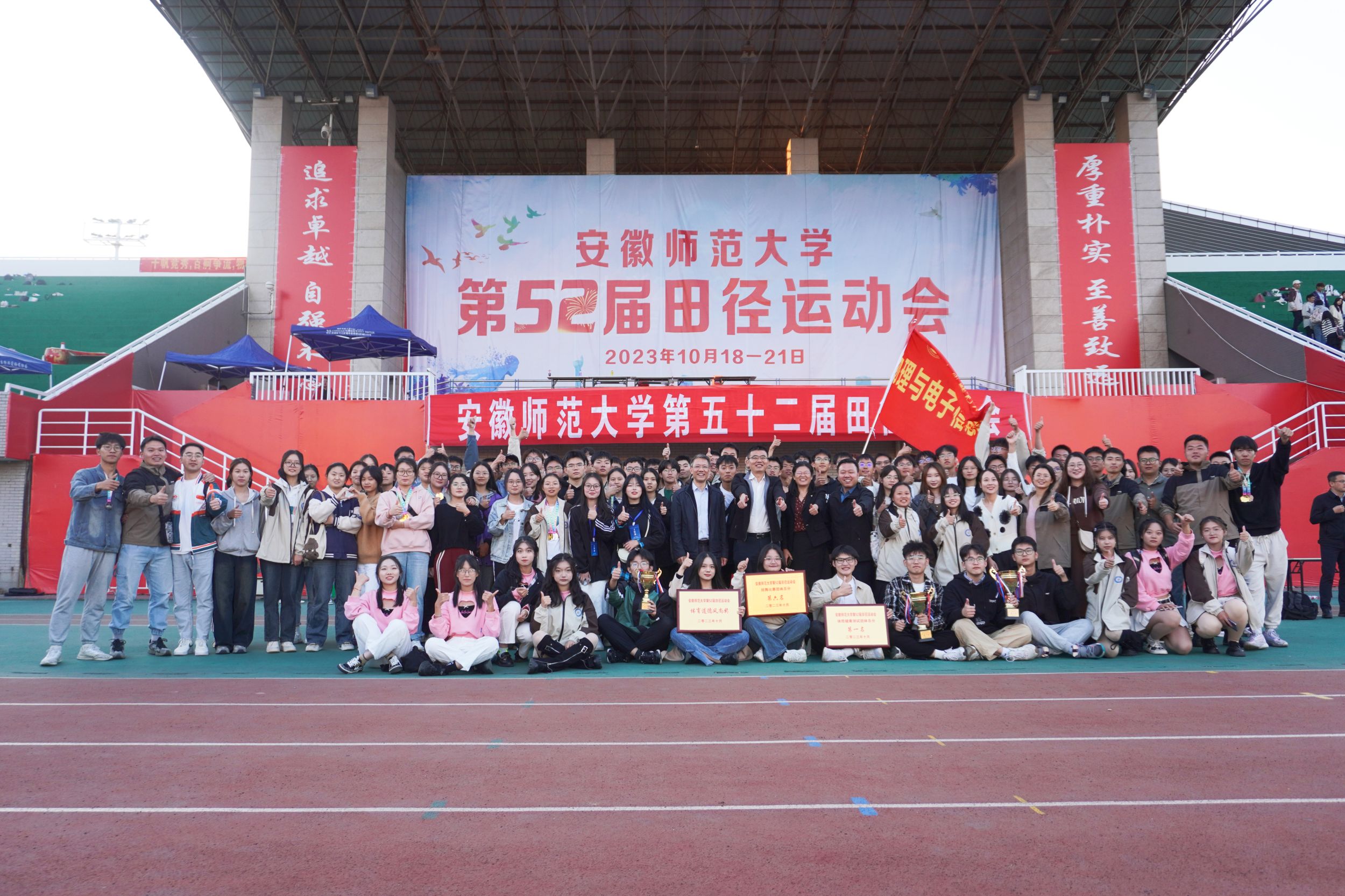 校运无限精彩,物电乘势而来!10月18日至21日,安徽师范大学第52届田径运动会在花津校区体育场顺利举行。学院再获佳绩,获得学生甲组团体总分第一名、男子甲组团体总分第一名(蝉联“七连冠”)、女子甲组团体总分第五名、体质健康测试团体总分第一名、排舞比赛第六名。在运动场上,学院师生精诚团结、超越极限,践行“更高、更快、更强、更团结”的现代奥林匹克精神,充分展现物电师生朝气蓬勃,奋发有为的精神风貌。